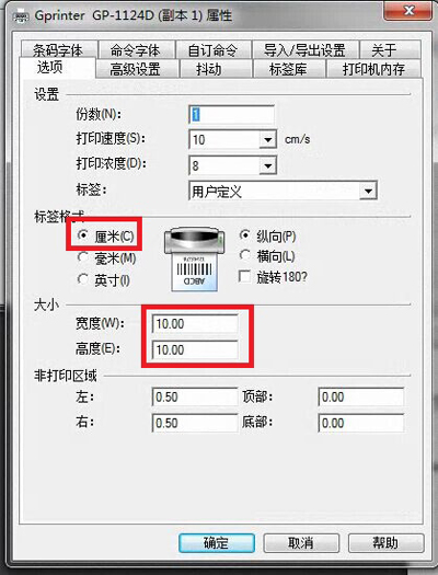 比如,斑马打印机,标签格式选择“厘米”,宽和高均选择“10”,如图: