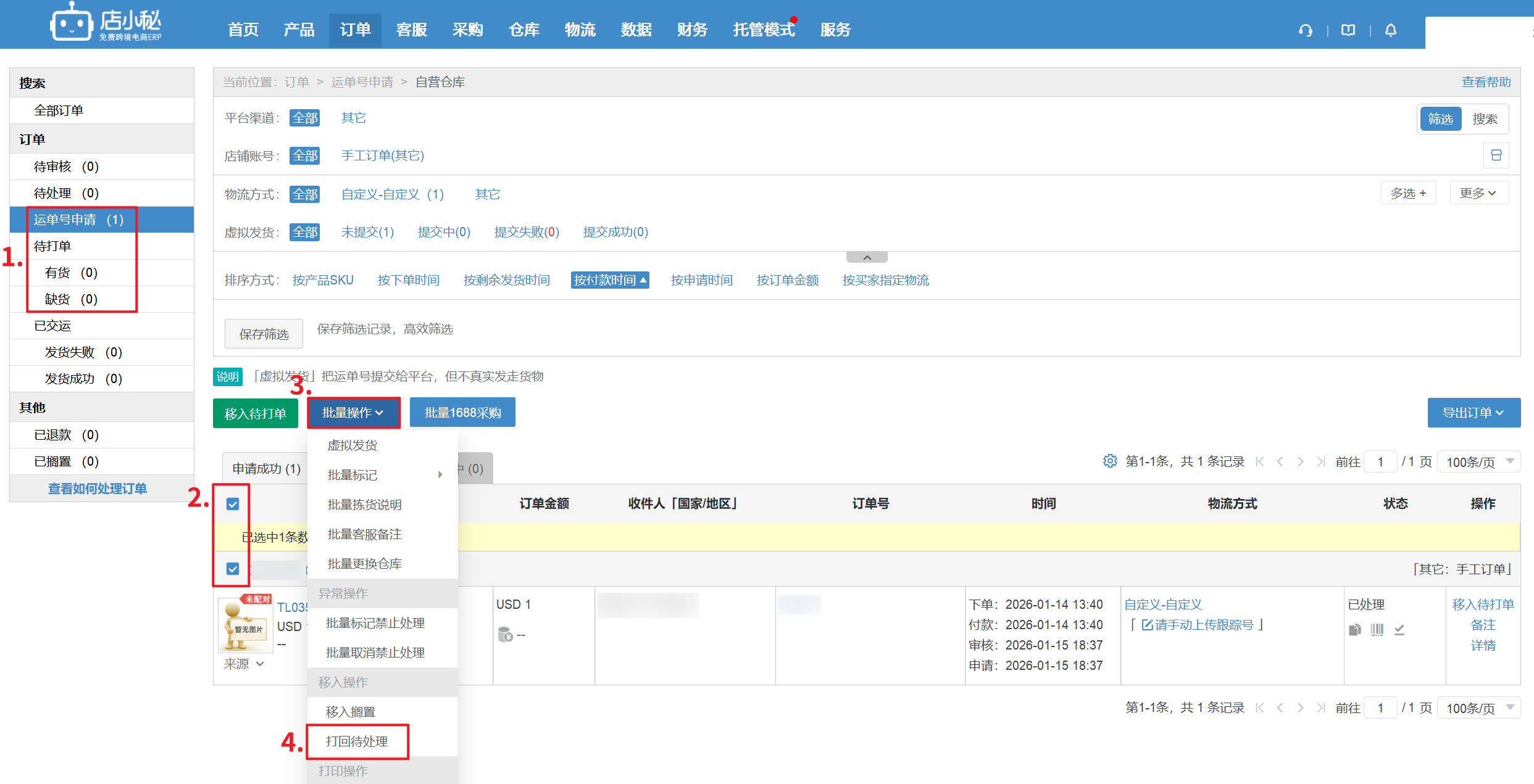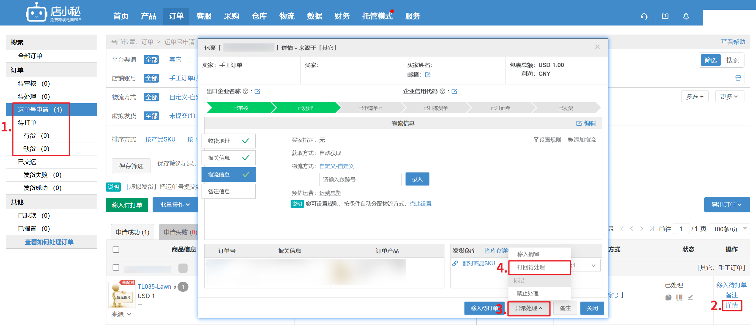 1、单个订单操作:【运单号申请/待打单状态—订单详情—异常处理—打回待处理】