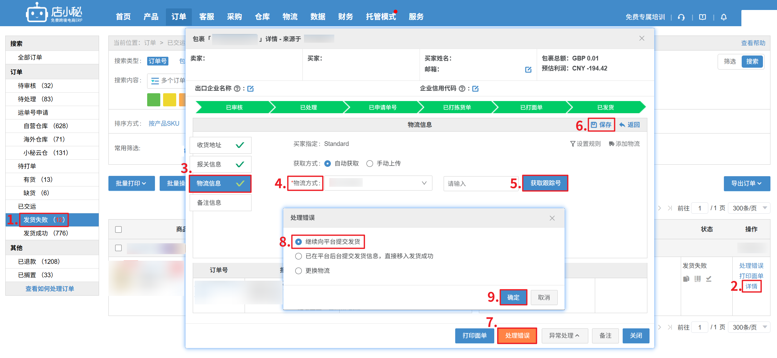 可以点击【订单详情—物流信息—编辑—选择物流方式—获取跟踪号—保存—处理错误—继续向平台提交发货】