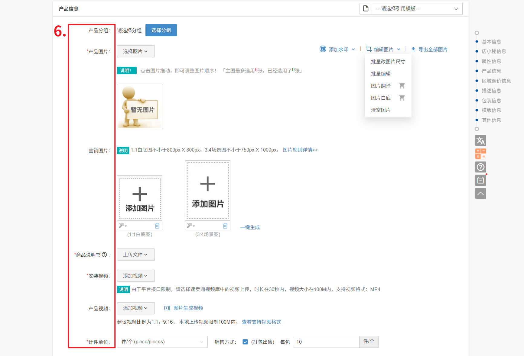 ⑥ 产品视频:1、仅支持单个编辑页上传,建议视频比例为1:1或9:16;本地上传视频限制100M内