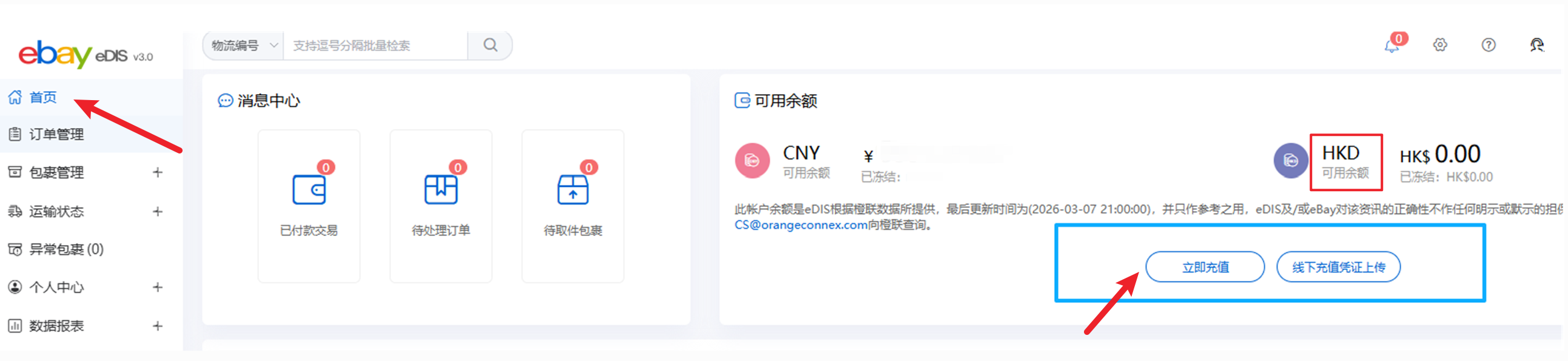1、登录eDIS 3.0首页入口,可查看余额,点击立即充值即可
