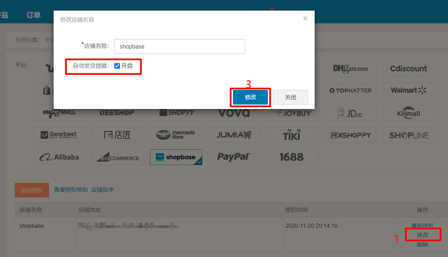 注意事项:【1】开启后,对后续到小秘页面提交发货/虚拟发货的订单生效【2】小秘页面只是触发ShopBase去发送,具体提醒内容不受小秘控制,需要到ShopBase后台设置操作流程:第一步:【用户名—平台授权位置点击ShopBase—找到对应店铺—重新修改—勾选开启自动发货提醒】