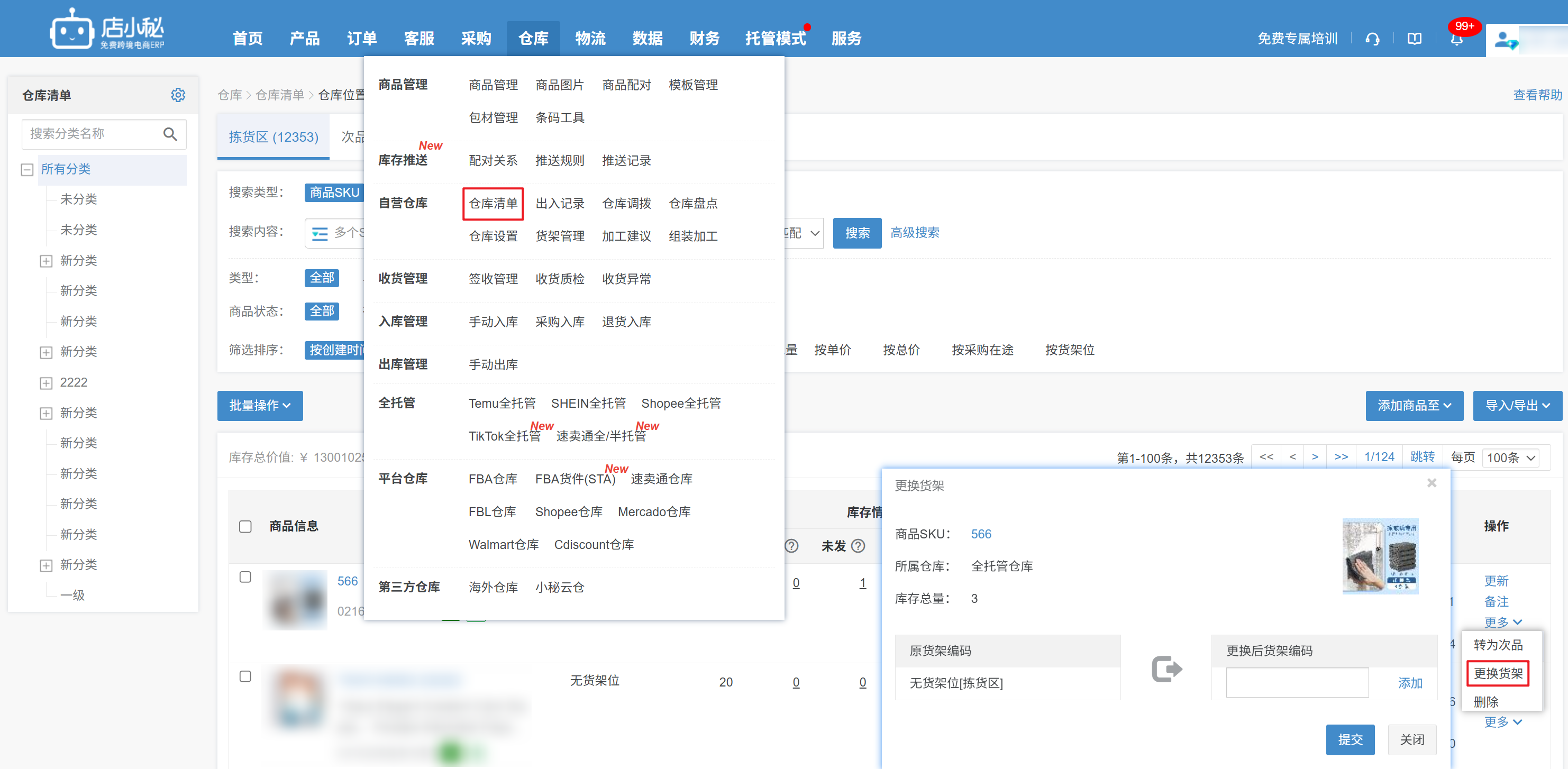 【仓库—仓库清单—更多—更换货架—添加选择货架—提交即可】