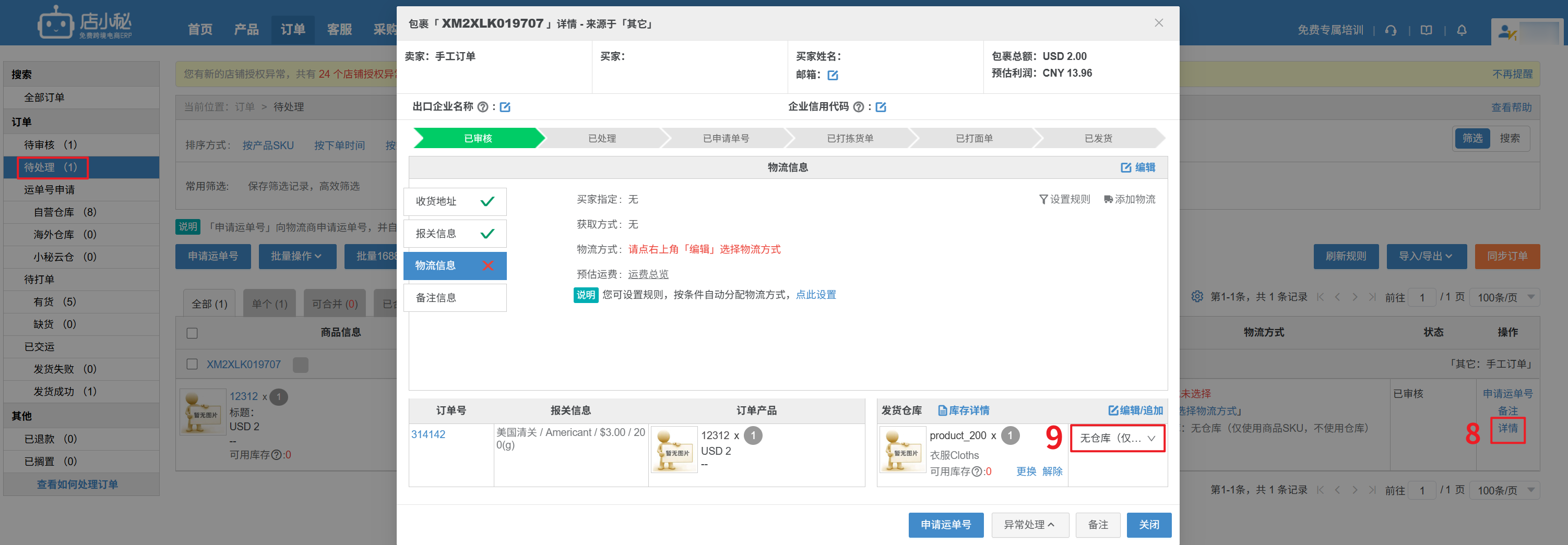 点击订单详情—可查看订单配对的商品SKU以及出库仓库