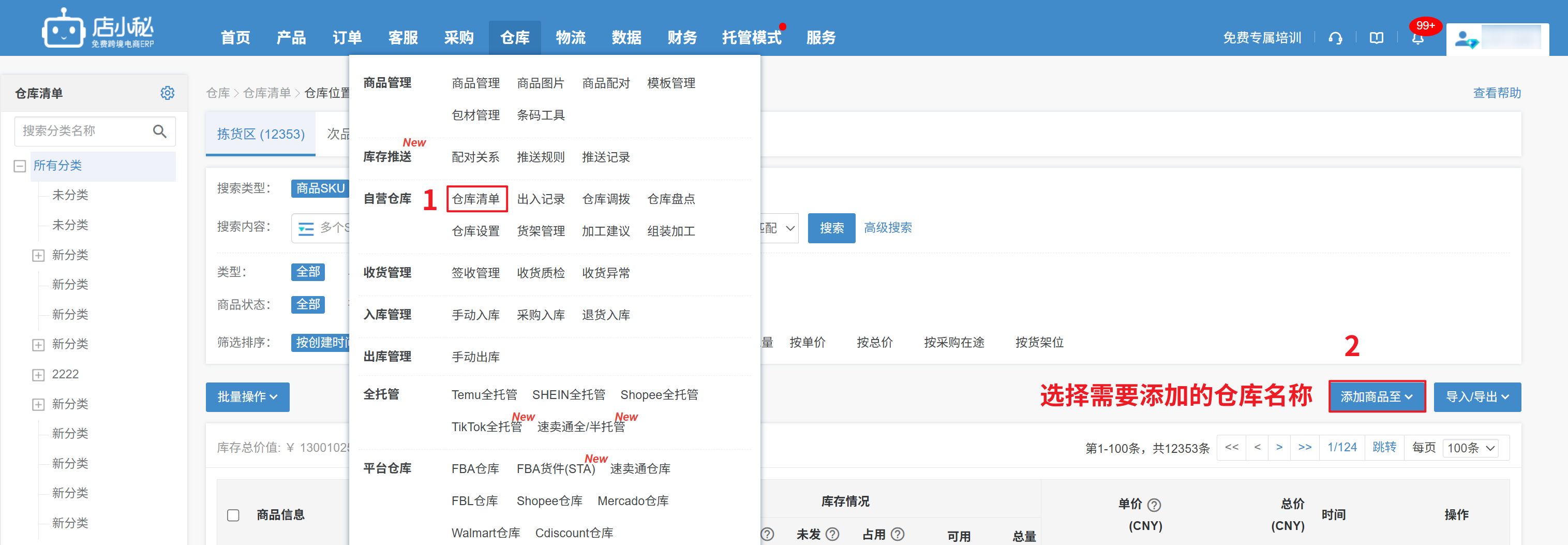 【仓库—仓库清单—添加商品至「选择仓库」—勾选商品—保存】