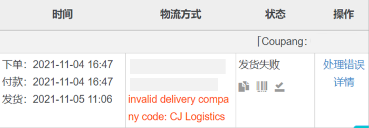 Q1:Coupang订单发货报错:invalid delivery company:××