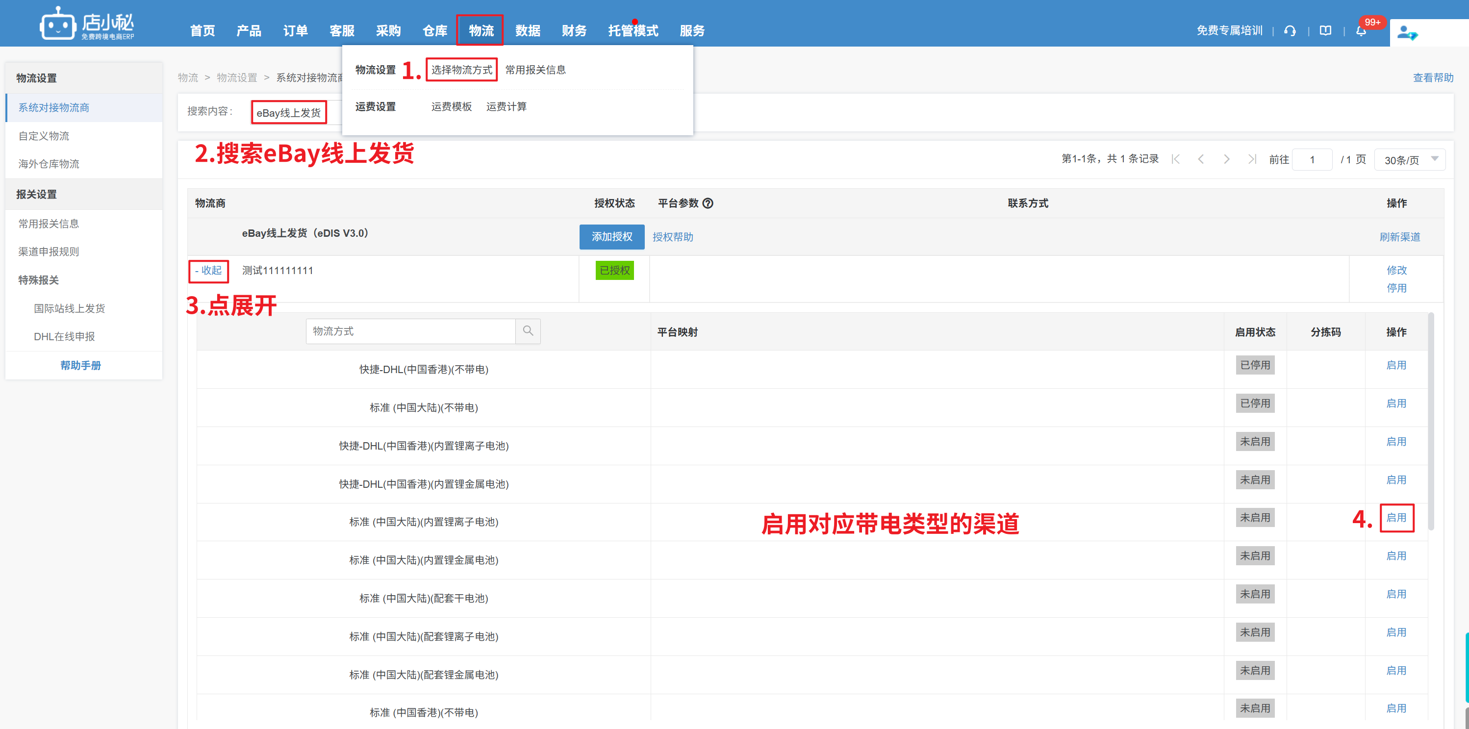 解决方案:【物流—选择物流方式—搜索eBay线上发货—点击展开—选择对应带电类型的渠道—启用—完善物流设置—保存】