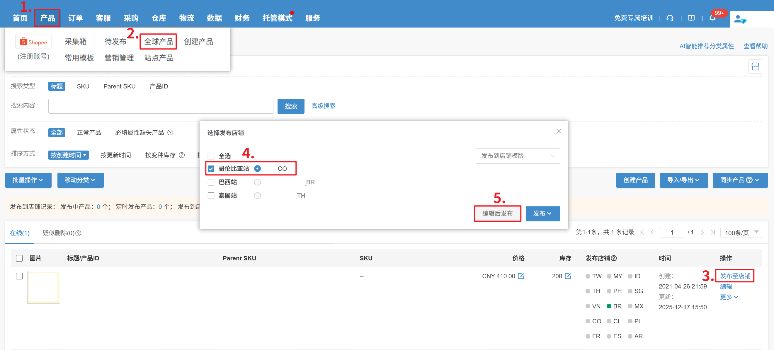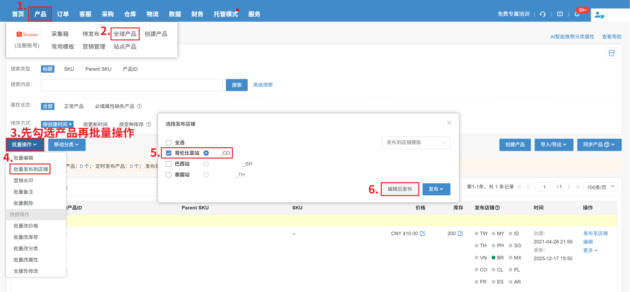 【产品—全球产品—勾选产品—批量操作—批量发布到店铺—选择发布的店铺—编辑后发布—店铺价格点击修改—