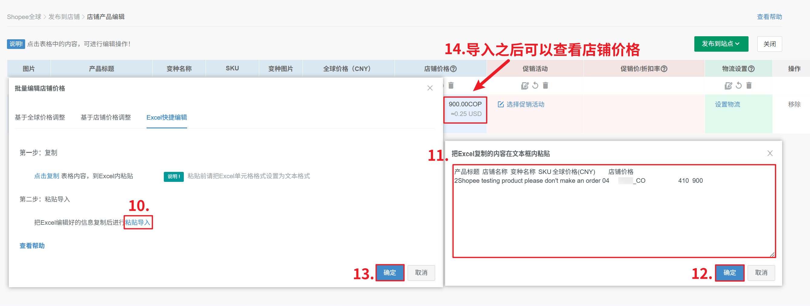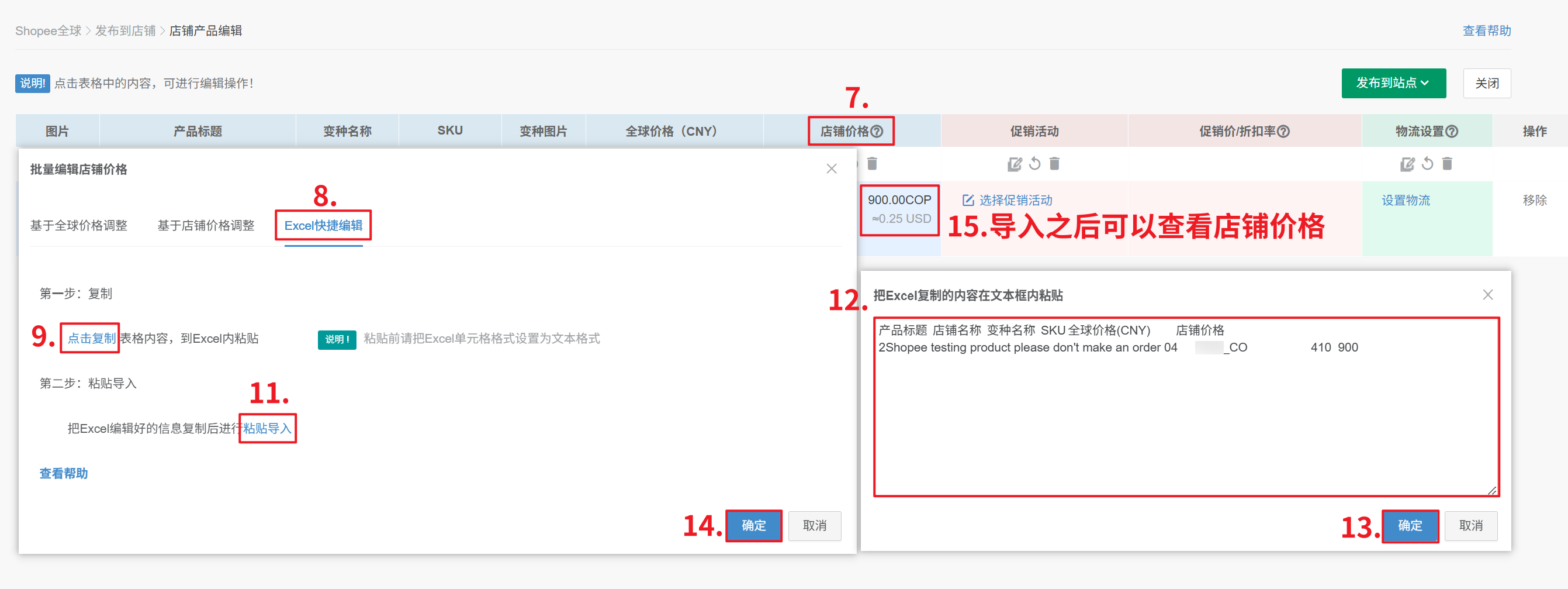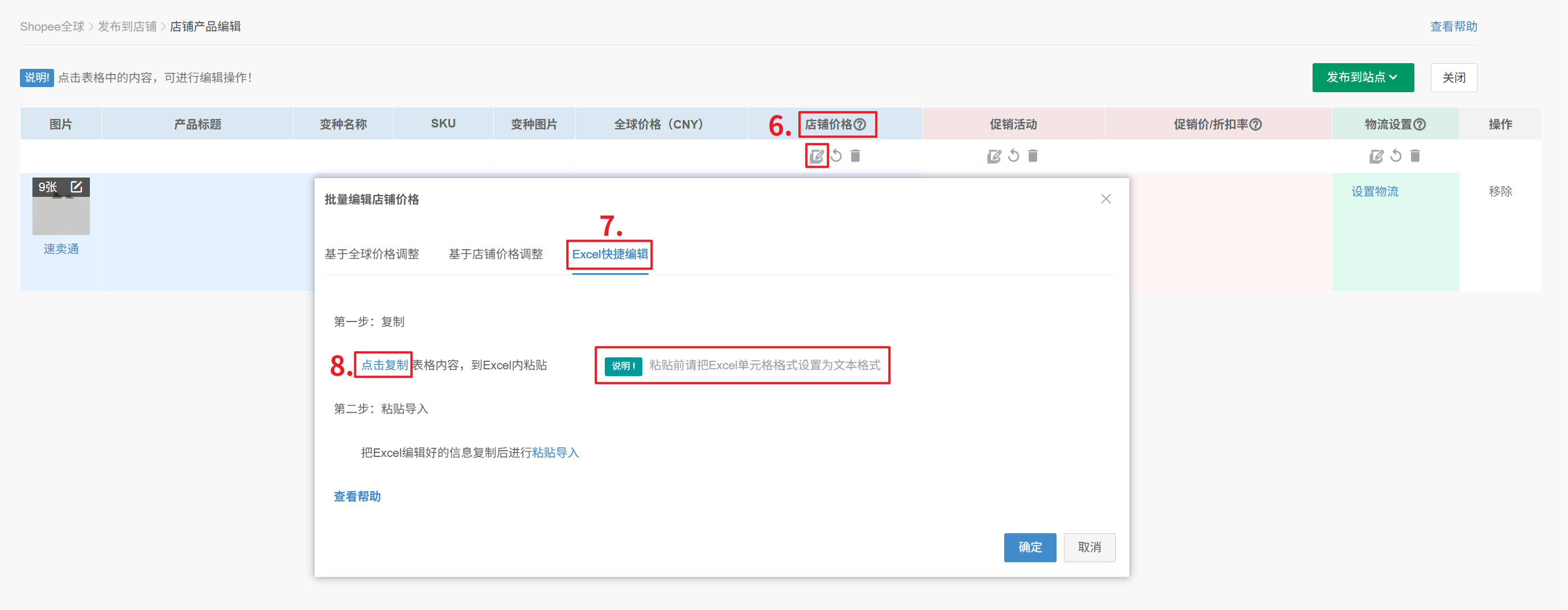 第一步:【产品—全球产品—发布至店铺—选择发布的店铺—编辑后发布—店铺价格点击修改—Excel快捷编辑—点击复制】