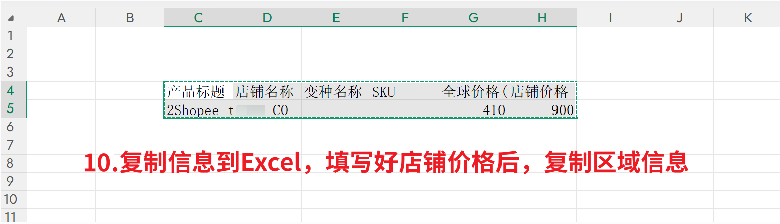 第二步:【打开Excel—粘贴—输入店铺的价格—复制产品信息的区域】