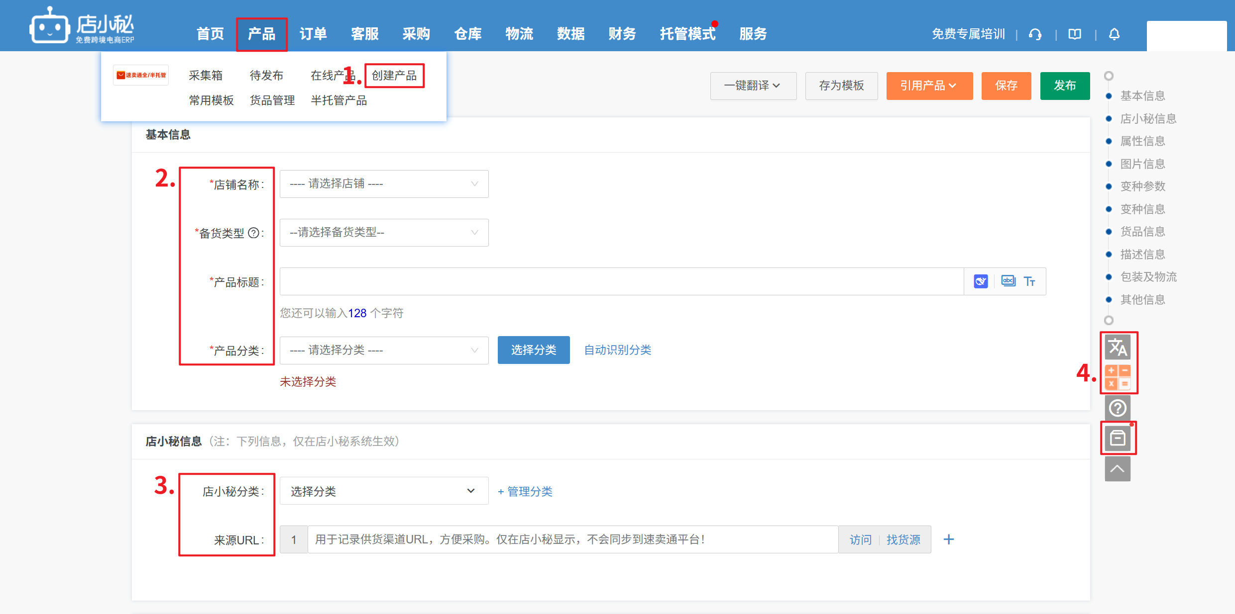 ① 店铺名称:选择具体要发布到哪个店铺账号(显示的名称为授权到小秘系统自定义命名的店铺名称)