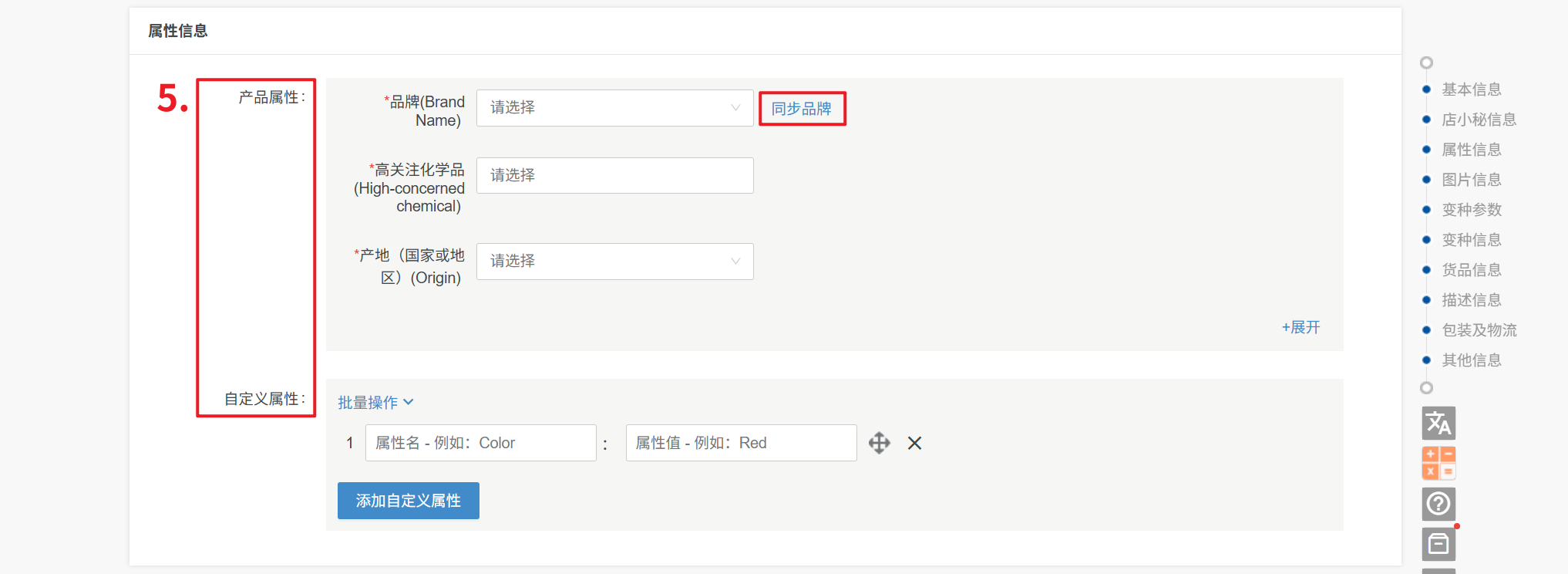 ① 产品属性:不同的产品分类,产品属性不一样,根据实际产品选择即可,带*号必填
