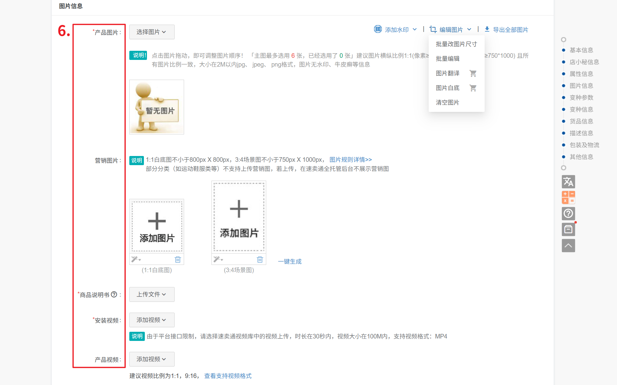 注意:1、主图最多上传6张;图片比例1:1(像素≥800*800) 或3:4 (像素≥750*1000)