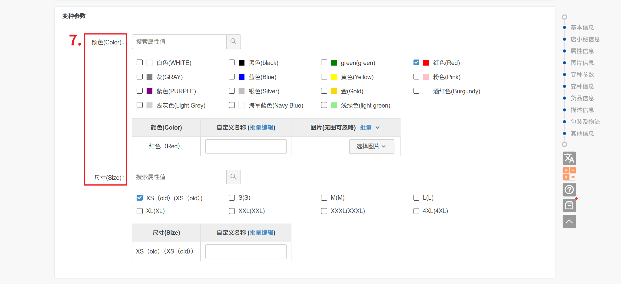 注意:1、如果没有对应颜色,可任意勾选颜色后,输入自定义名称(速卖通买家前台会展示自定义名称)