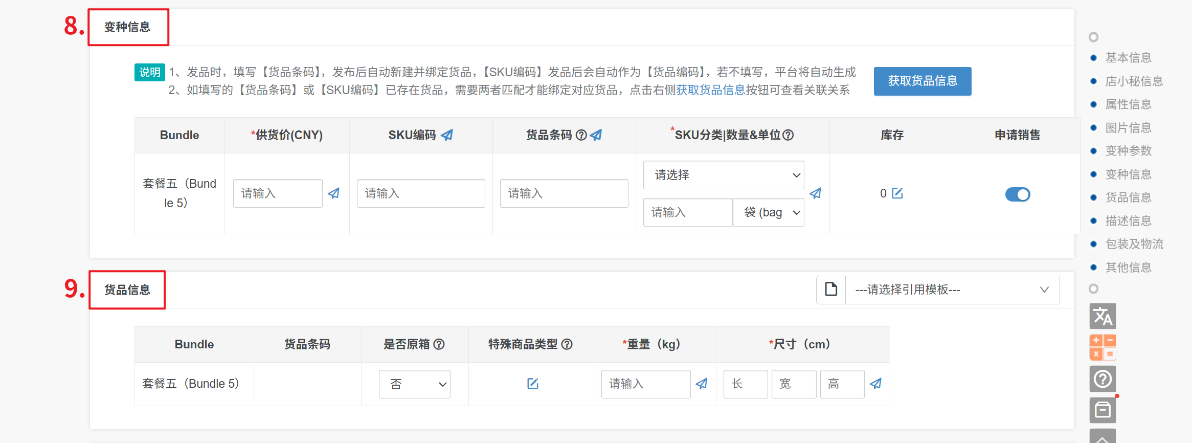 注意:1、发品时,若填写货品条码,发布后自动新建并绑定货品,SKU编码发品后会自动作为货品编码,