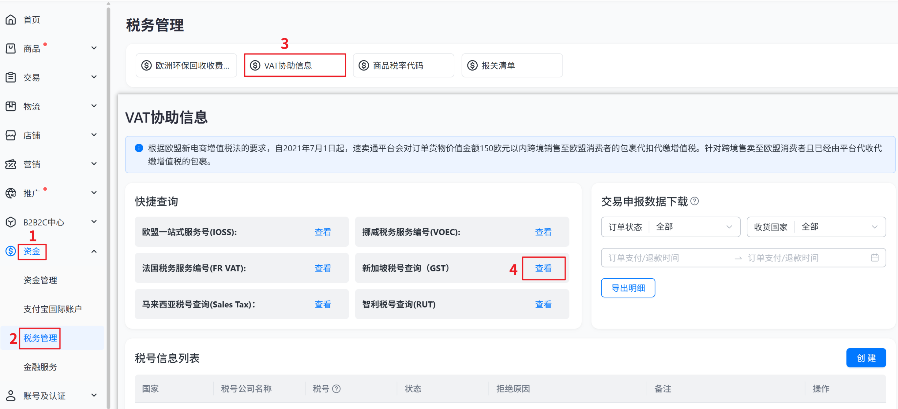 2、速卖通后台查看:【资金—税务管理—VAT协助信息—新加坡税号查询(GST)—查看】