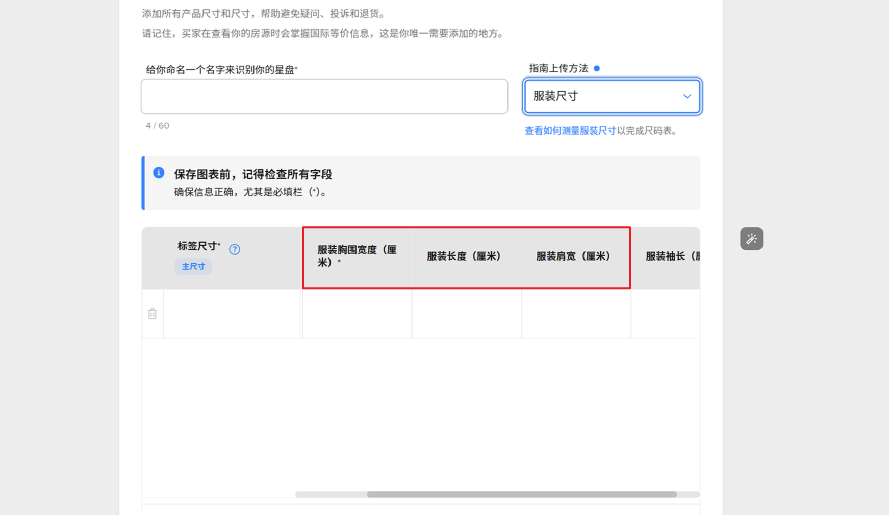 Q3:美客多后台创建服装尺码有胸围宽度、衣长、肩宽的字段,小秘创建尺码表模板没有显示,但产品编辑页面又有显示这些字段?