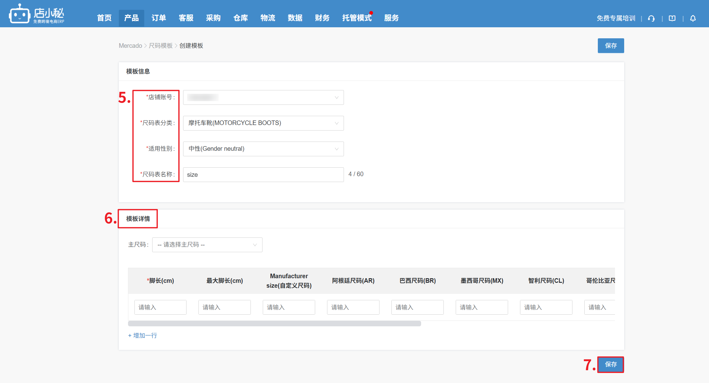 【产品—常用模板—尺码模板—创建模板—选择店铺/尺码表分类/适用性别—自定义模板名称—选择主尺码—填写尺码信息—保存】