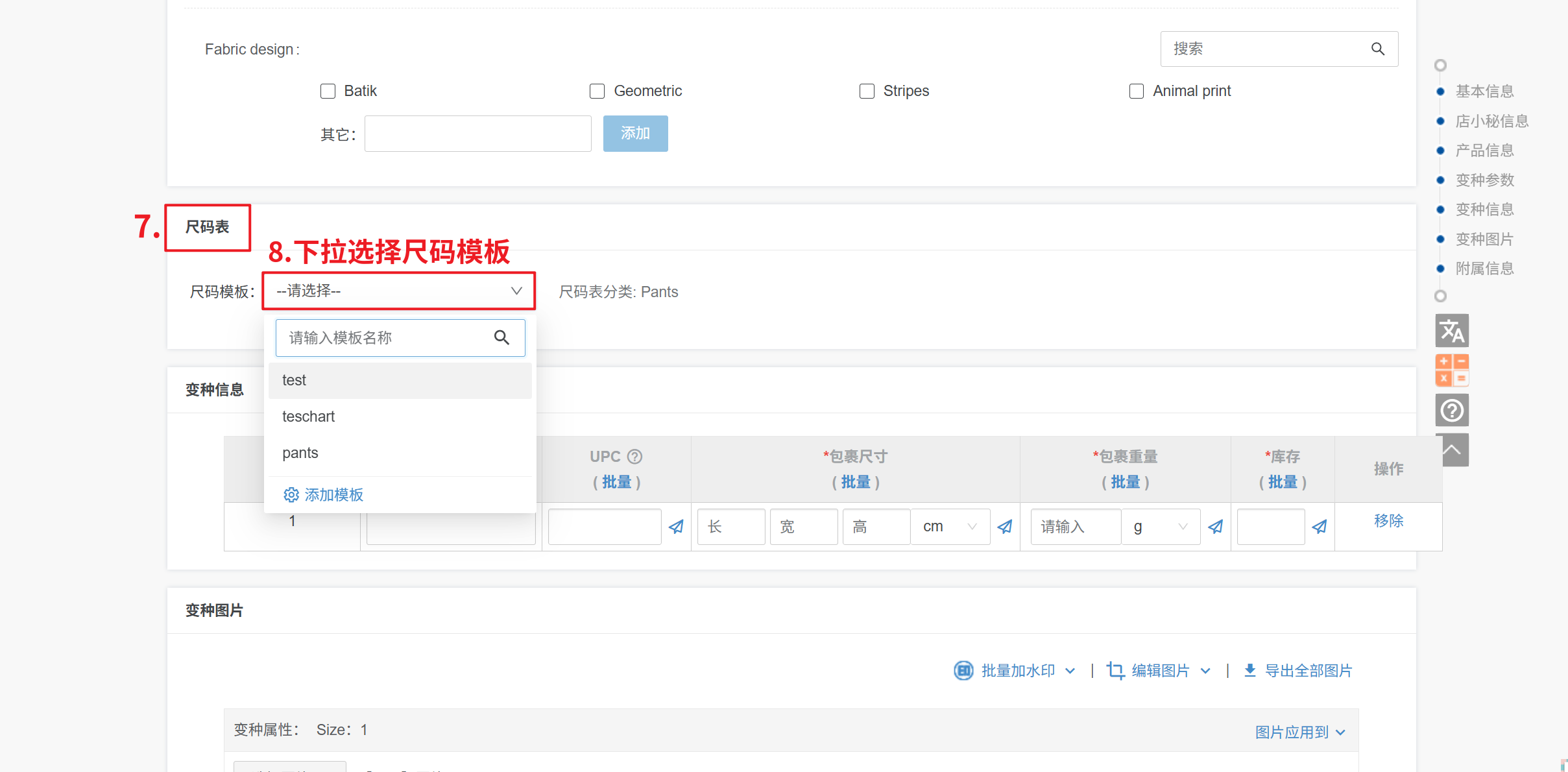 定义:在编辑产品时,可直接引用尺码表模板,提升产品刊登效率