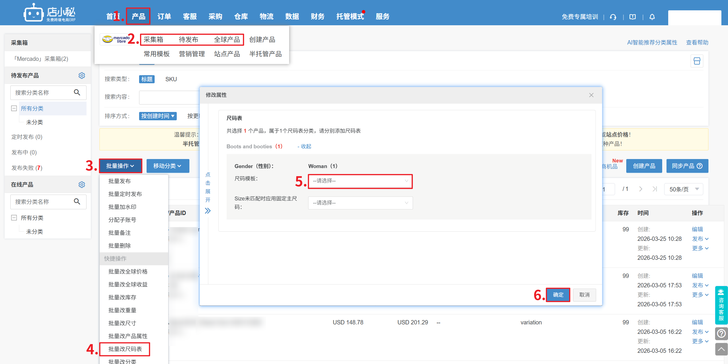 【产品—采集箱/待发布/全球产品—勾选产品—批量操作—批量改尺码表—选择尺码模板—确定】