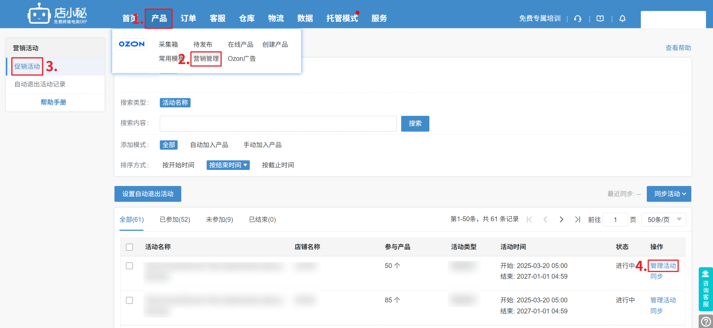 第一步:【Ozon—营销活动—促销活动—同步活动—管理活动】