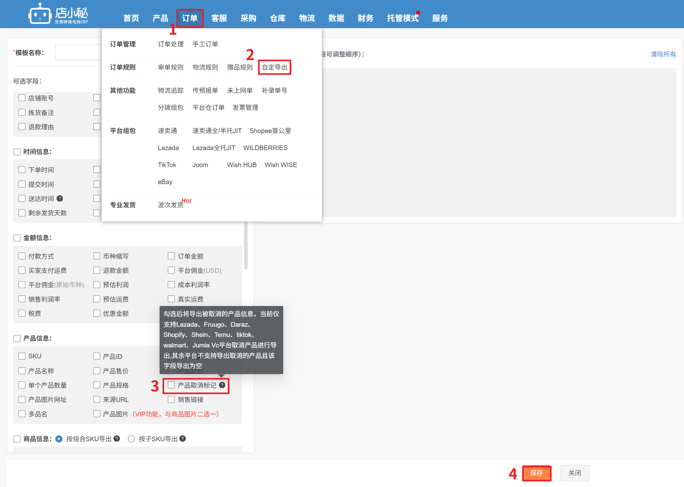 【订单—自定导出—创建模板—勾选产品取消标记—保存】再到订单页面导出订单选择对应的模板导出即可