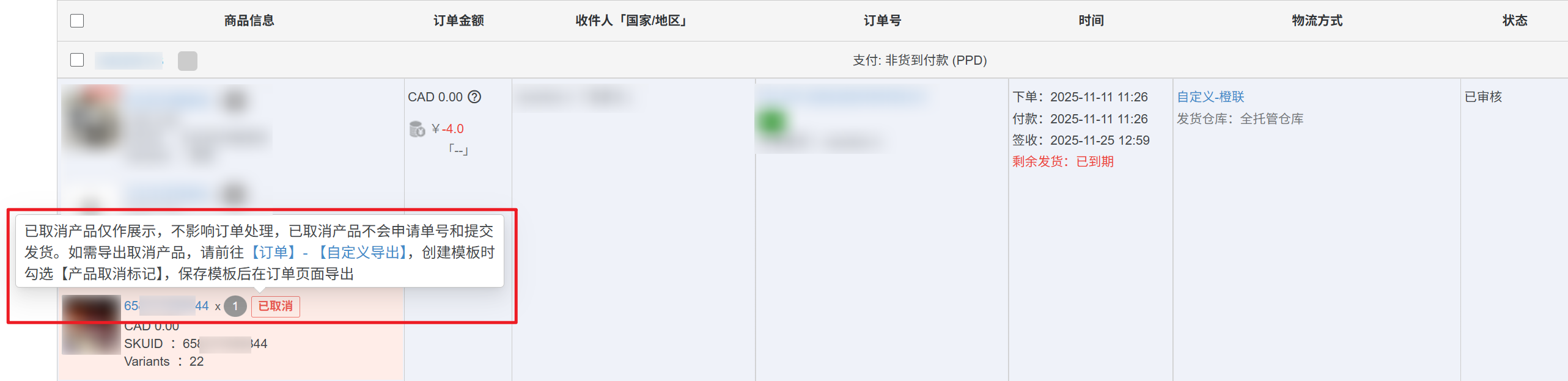 订单列表页都会显示已取消,已取消产品仅作展示,不影响订单处理,已取消产品不会申请单号和提交发货