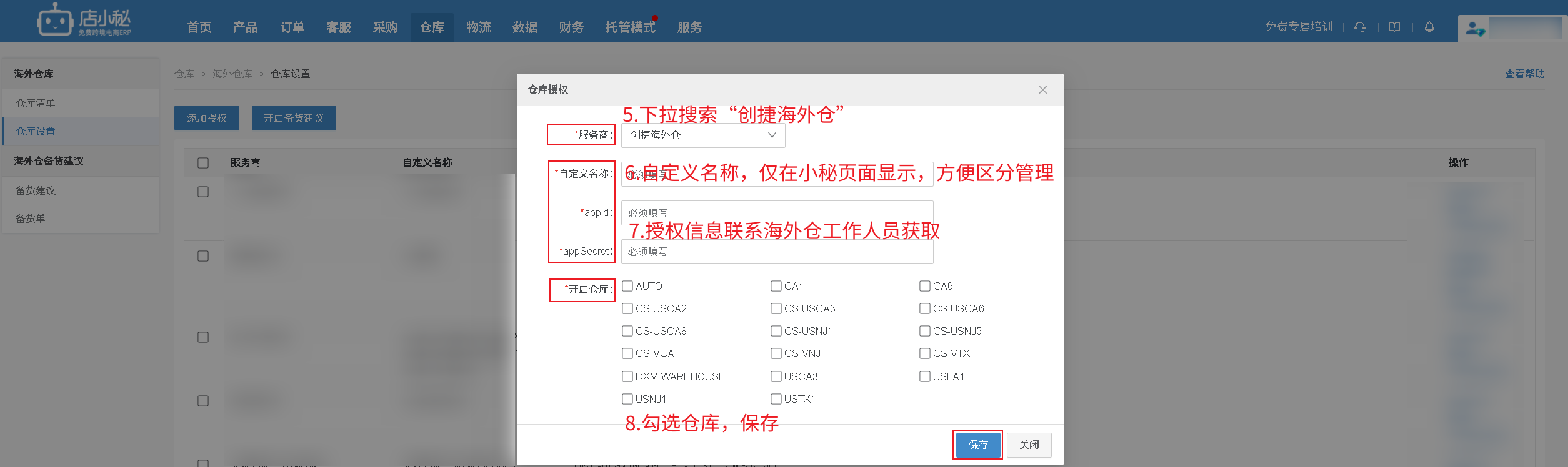 【仓库—海外仓库—仓库设置—添加授权—选择“创捷海外仓”—自定义名称—联系海外仓工作人员获取—勾选仓库—保存即可】