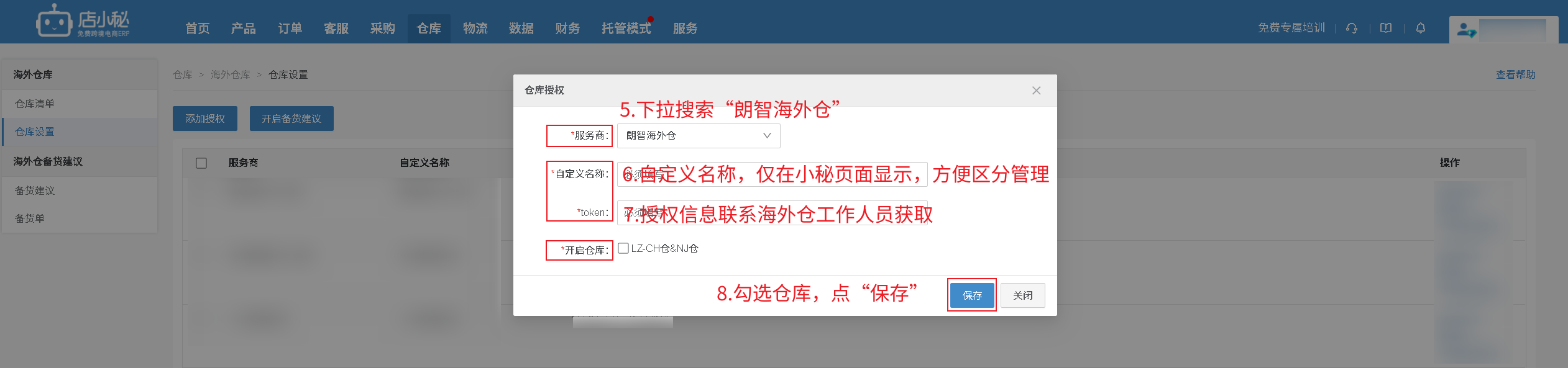 【仓库—海外仓库—仓库设置—添加授权—选择对应的海外仓—自定义名称—联系海外仓工作人员获取—勾选仓库—保存即可】