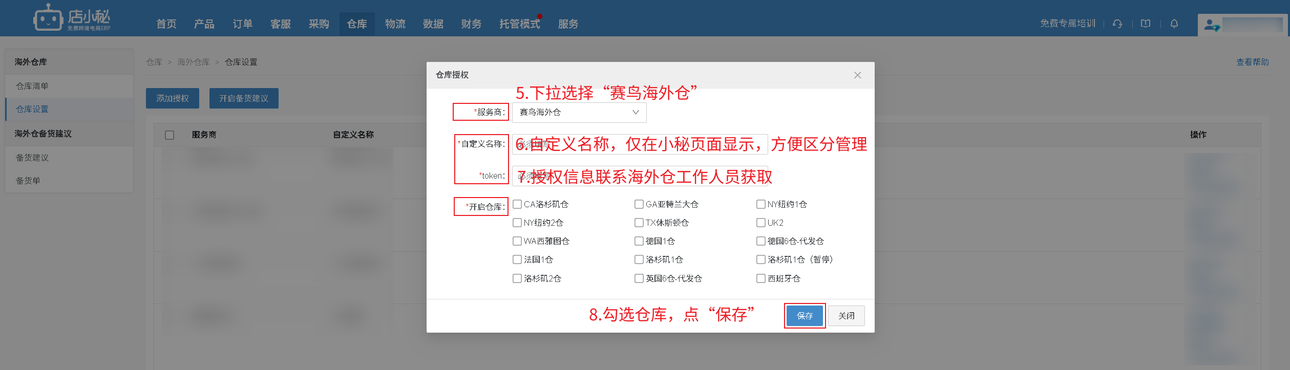 ”—自定义名称—联系海外仓工作人员获取—勾选仓库—保存即可】