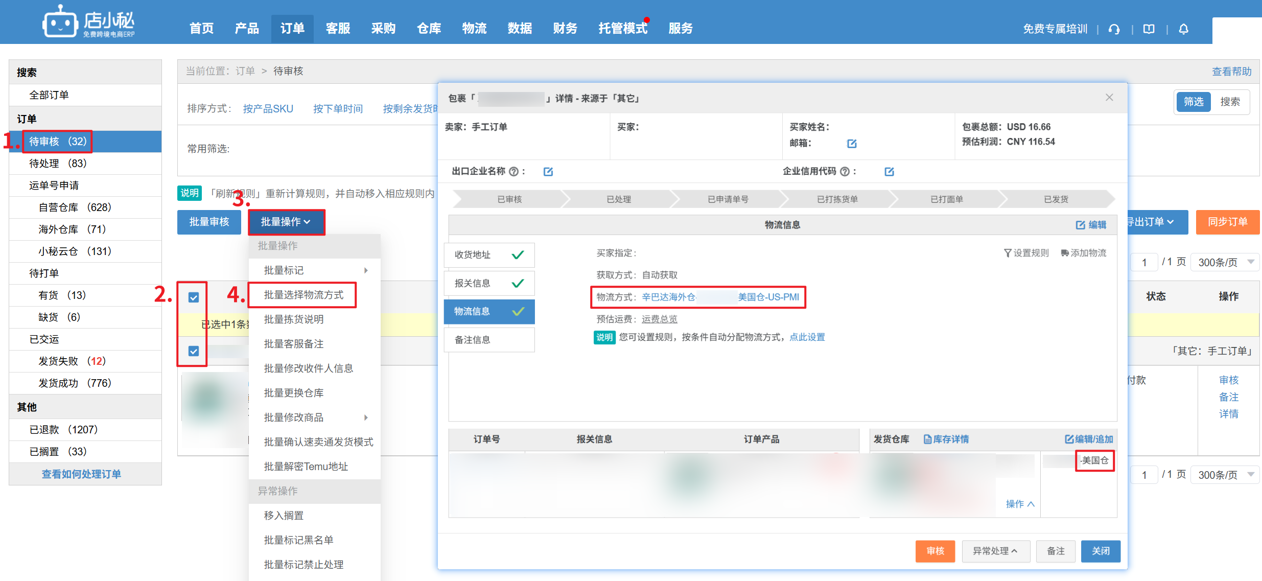 解决方案:在待审核状态下,先批量选择物流方式,选择海外仓渠道后,订单会自动匹配到海外仓的仓库,