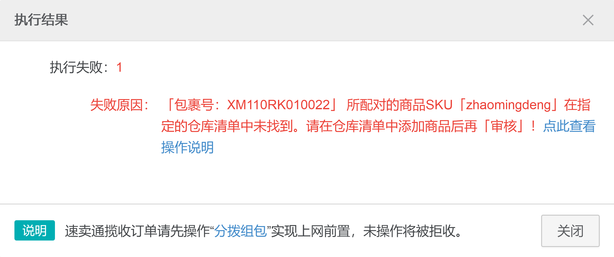 仓库清单的商品SKU是删除后新增加的,需要重新配对关系才可以操作订单
