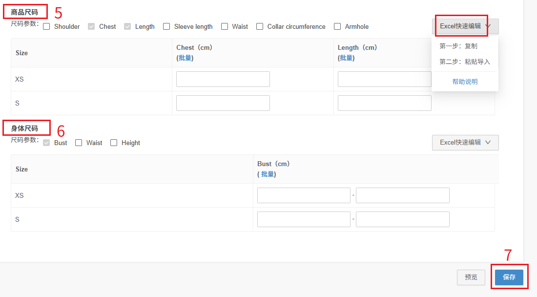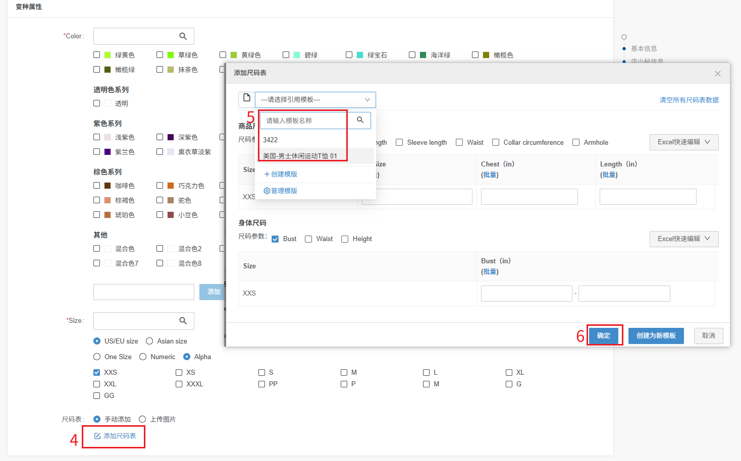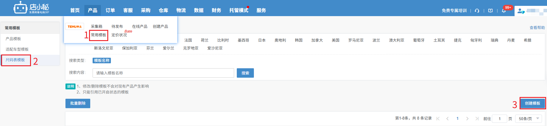 注意事项:【1】发布产品选择的分类要和创建尺码表模板选择的分类一致【2】修改/删除模板不会对现有产品产生影响【3】只能引用已开启状态的模板