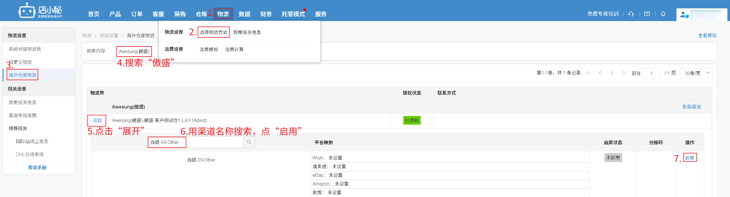 第一步完成授权后,仅代表店小秘和海外仓的授权打通了,接下来要告诉海外仓你的订单走哪个渠道,仓库下面有很多渠道,