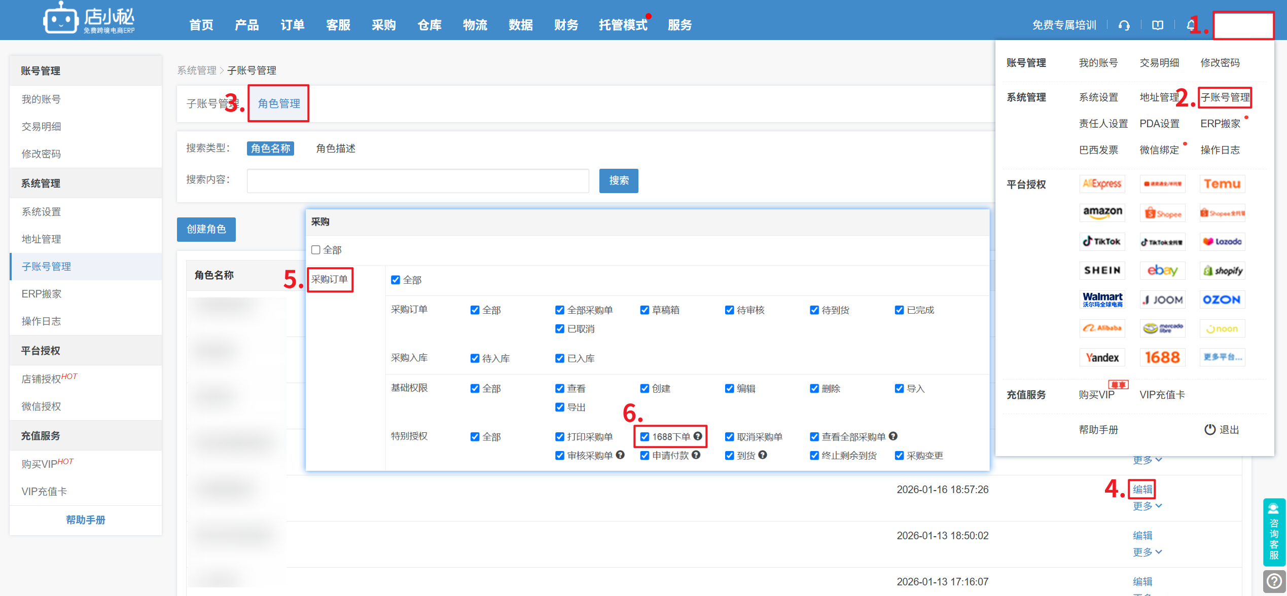 A2:【登录店小秘主账号—子账号管理—角色管理—编辑—采购订单—勾选“1688下单”】