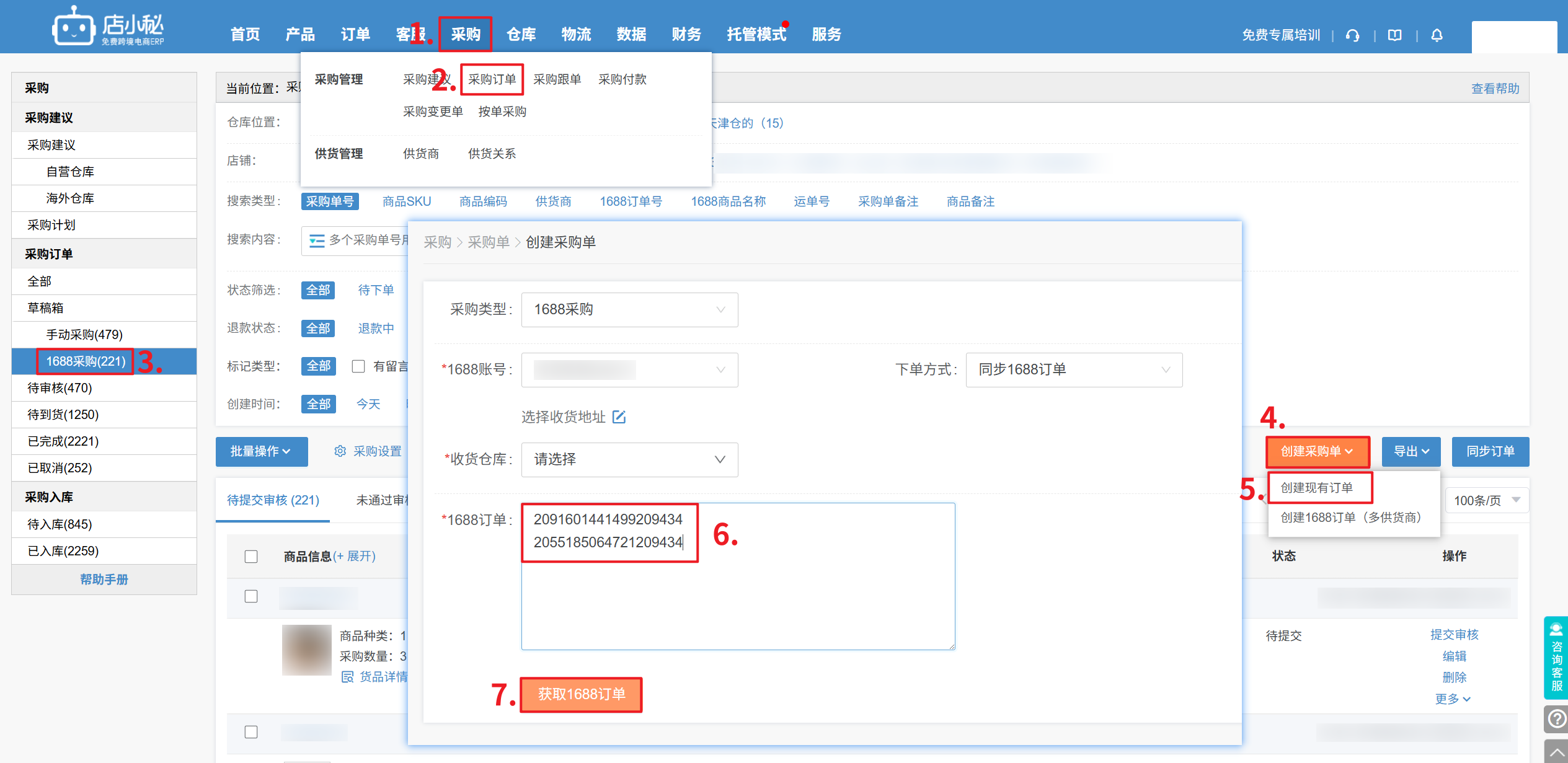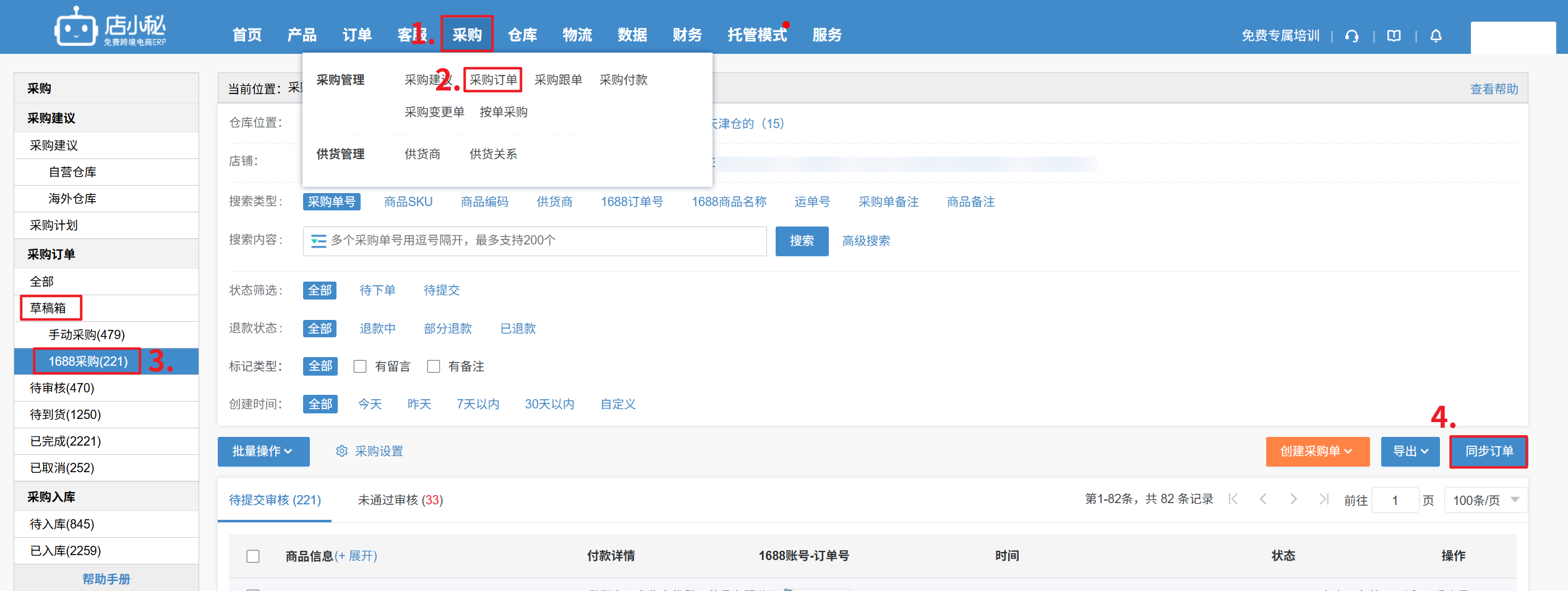 或者手动到【全部/草稿箱—1688采购—同步订单】,都可以将1688后台采购单同步到小秘