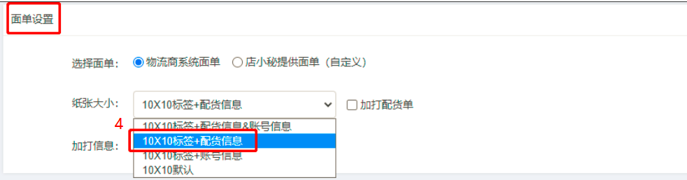 2、店小秘物流授权的位置渠道设置页面,打印类型选择带账号信息的类型