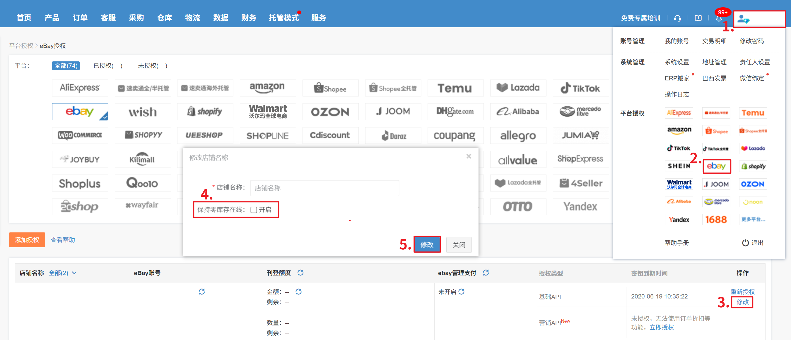 二、如果已经授权eBay店铺,可进入授权页面,点击修改开启:
