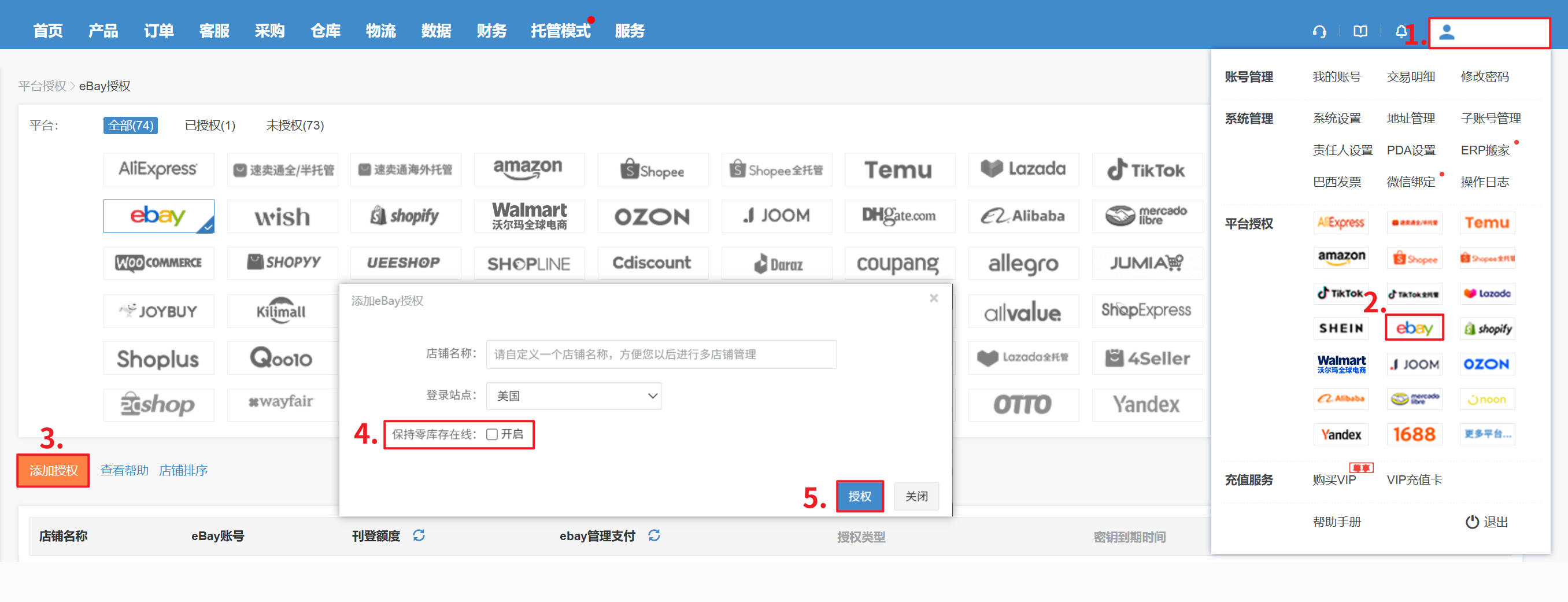 【用户名】—【平台授权】—【eBay】—【添加授权】,勾选 【保持零库存在线:开启】