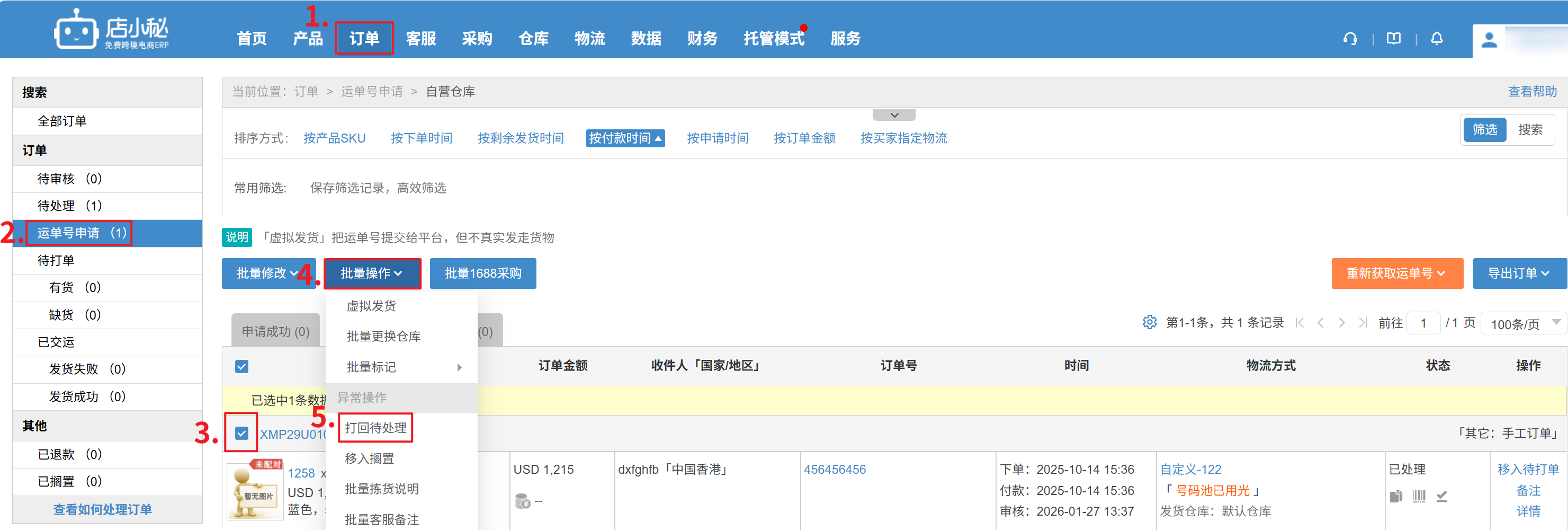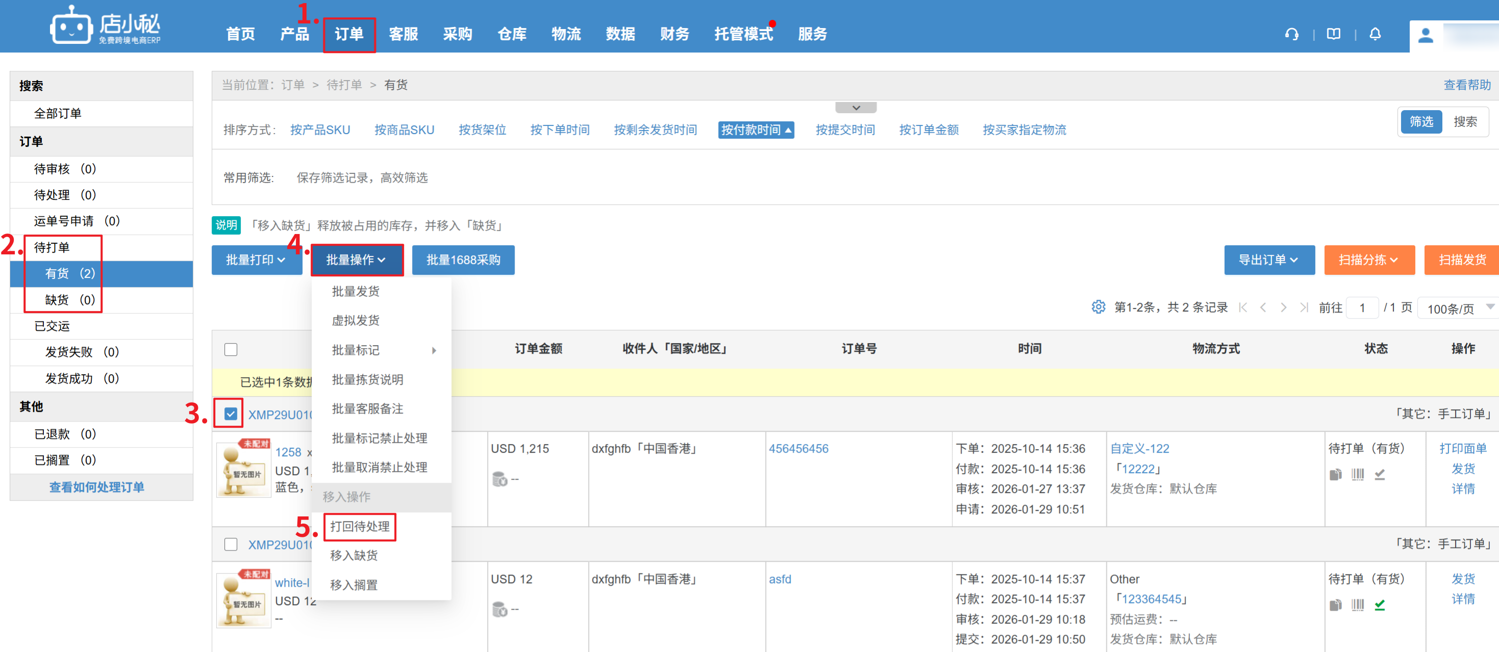 未虚拟发货:【可以勾选订单—批量操作—打回待处理,再批量编辑更改】