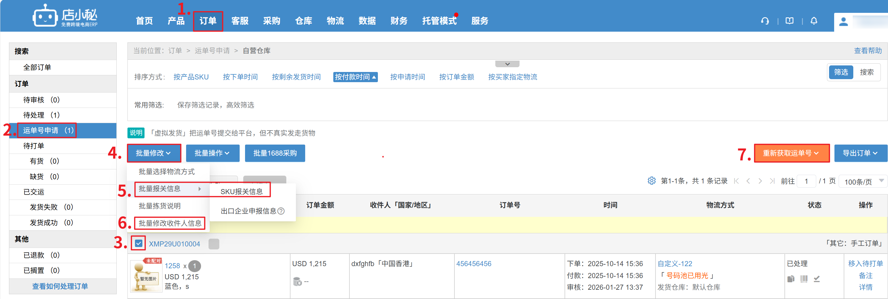 如果要批量重新获取单号,可以单个订单更改好收件人、报关信息后,勾选订单-批量换物流,操作