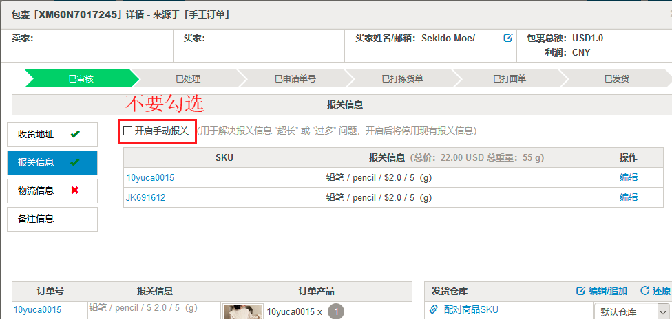 注意:1、订单详情—报关信息—不要开启手动报关,开启后,不会上传产品链接2、手工订单、Magento、Shopify、BigCommerce、UEESHOP、Mercado、Tiki、ShopBase、TikTok、Allvalue等平台订单没有返回产品链接,若这些平台的订单提示此报错,只能更换渠道申请单号