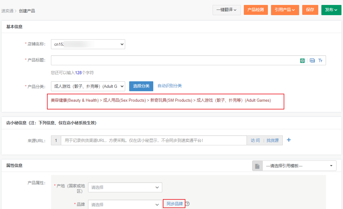 4、若在店小秘选择的类目跟速卖通后台申请通过的类目和品牌完全一致,但是发布产品还是报错品牌问题,