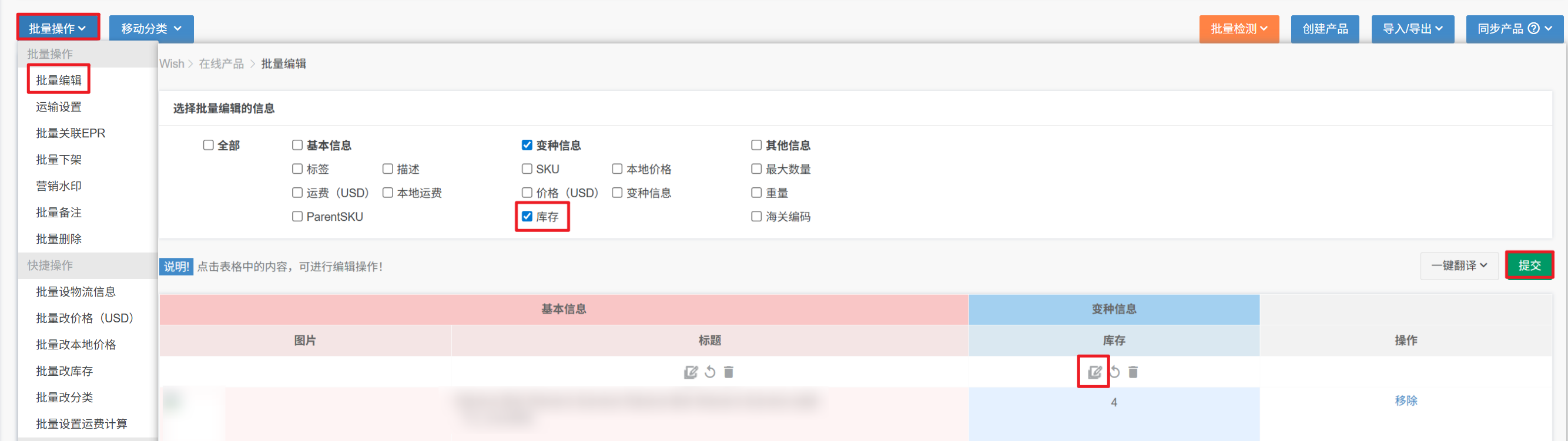 比如您产品在Wish后台已经更改了标题,但是小秘页面没有同步,直接批量编辑,修改了库存为1