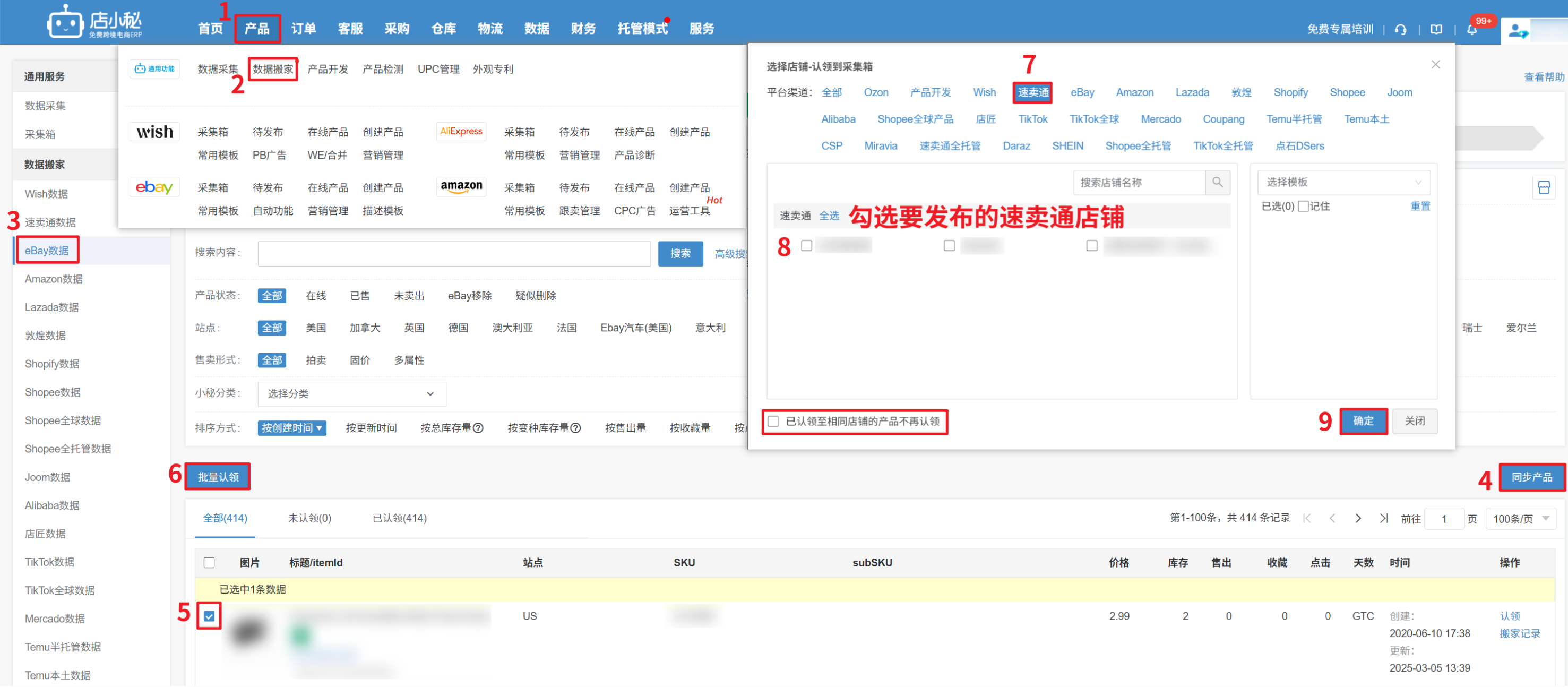 第三步:【产品—数据搬家—选择eBay数据—同步产品—勾选产品—批量认领—选择速卖通店铺—确定】