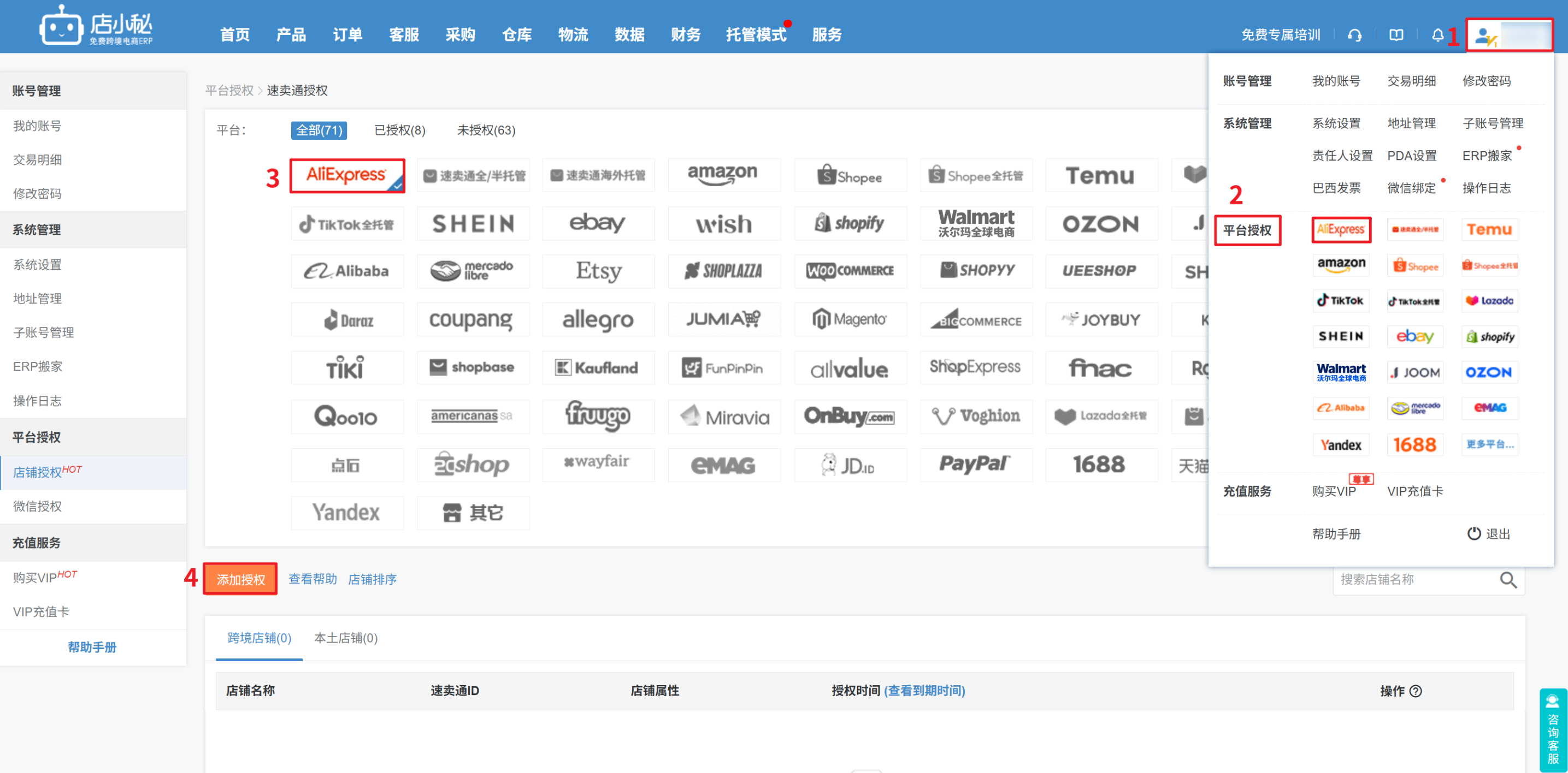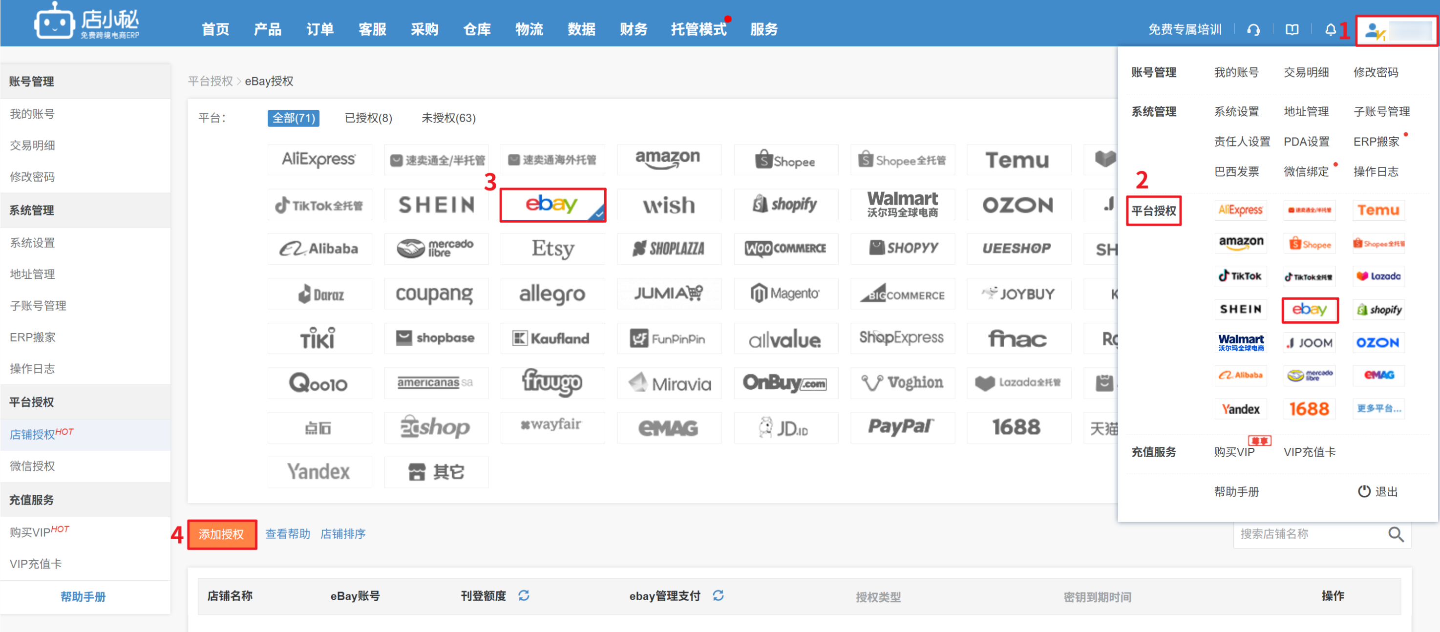 2、eBay店铺和速卖通店铺要授权到同一个小秘账号下进行数据搬家