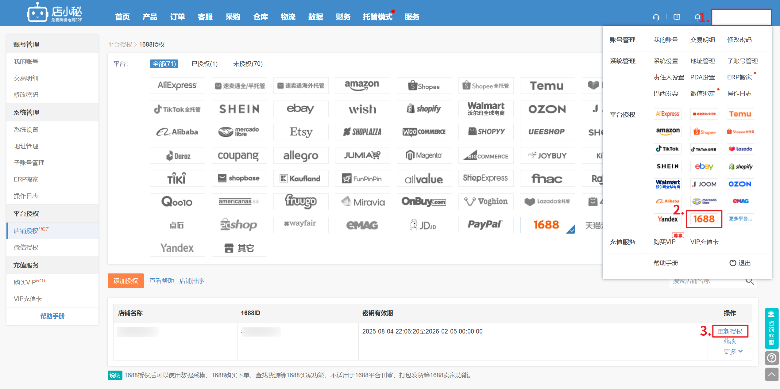 3、若1688账号授权到期,需要重新授权,【登录店小秘主账号—用户名—平台授权—点击“1688”—重新授权】