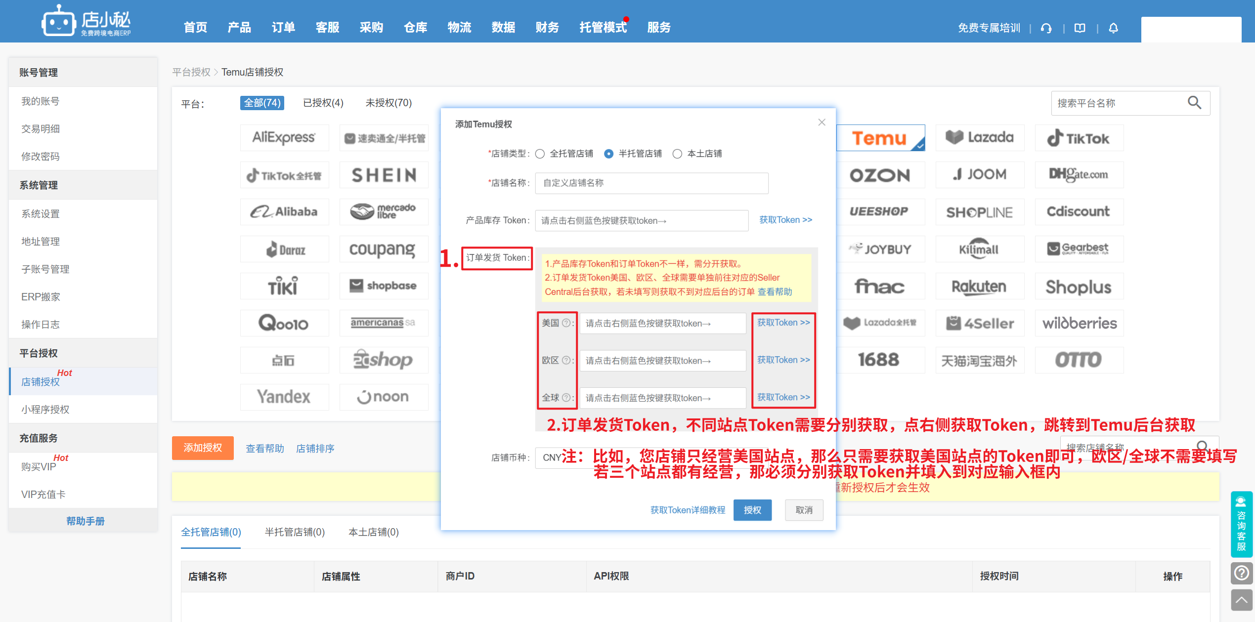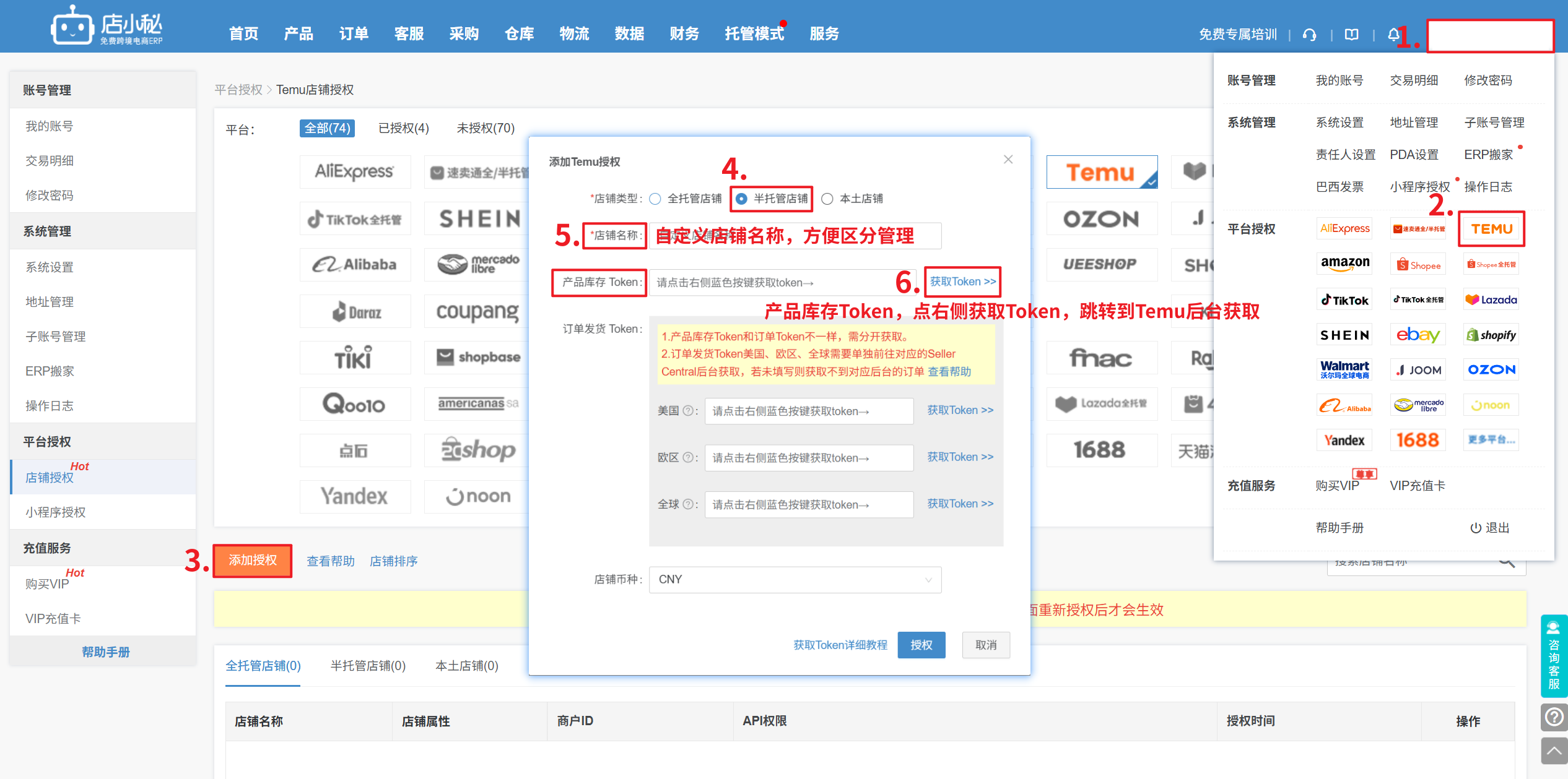 第一步:【登录小秘主账号—用户名—平台授权—点击Temu—添加授权—店铺类型选半托管店铺—自定义店铺名称