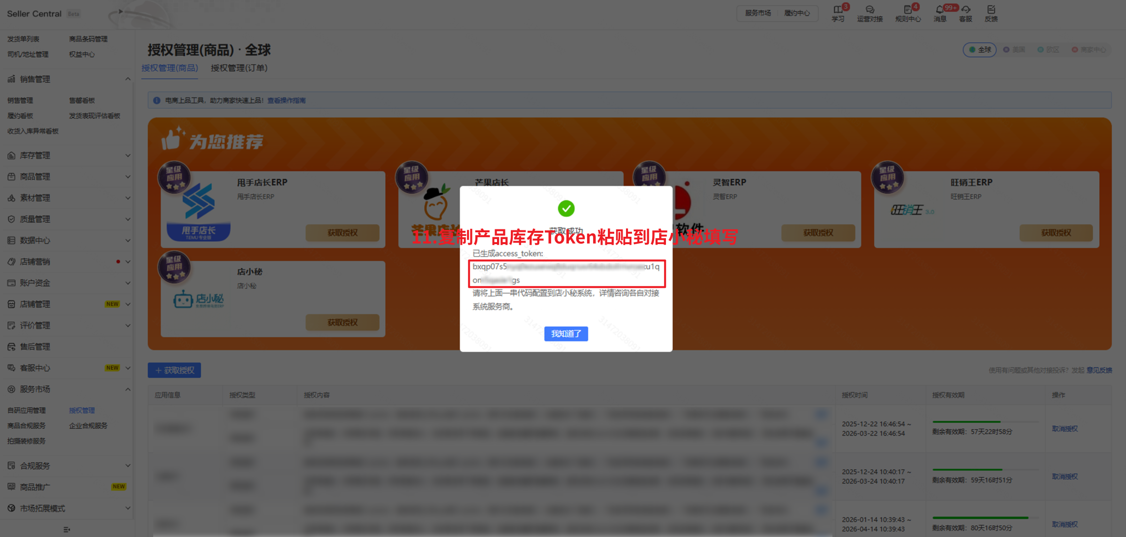 【Temu后台—Seller Central—服务市场—授权管理—右上角选择全球站点—授权管理(商品)—获取产品库存Token】