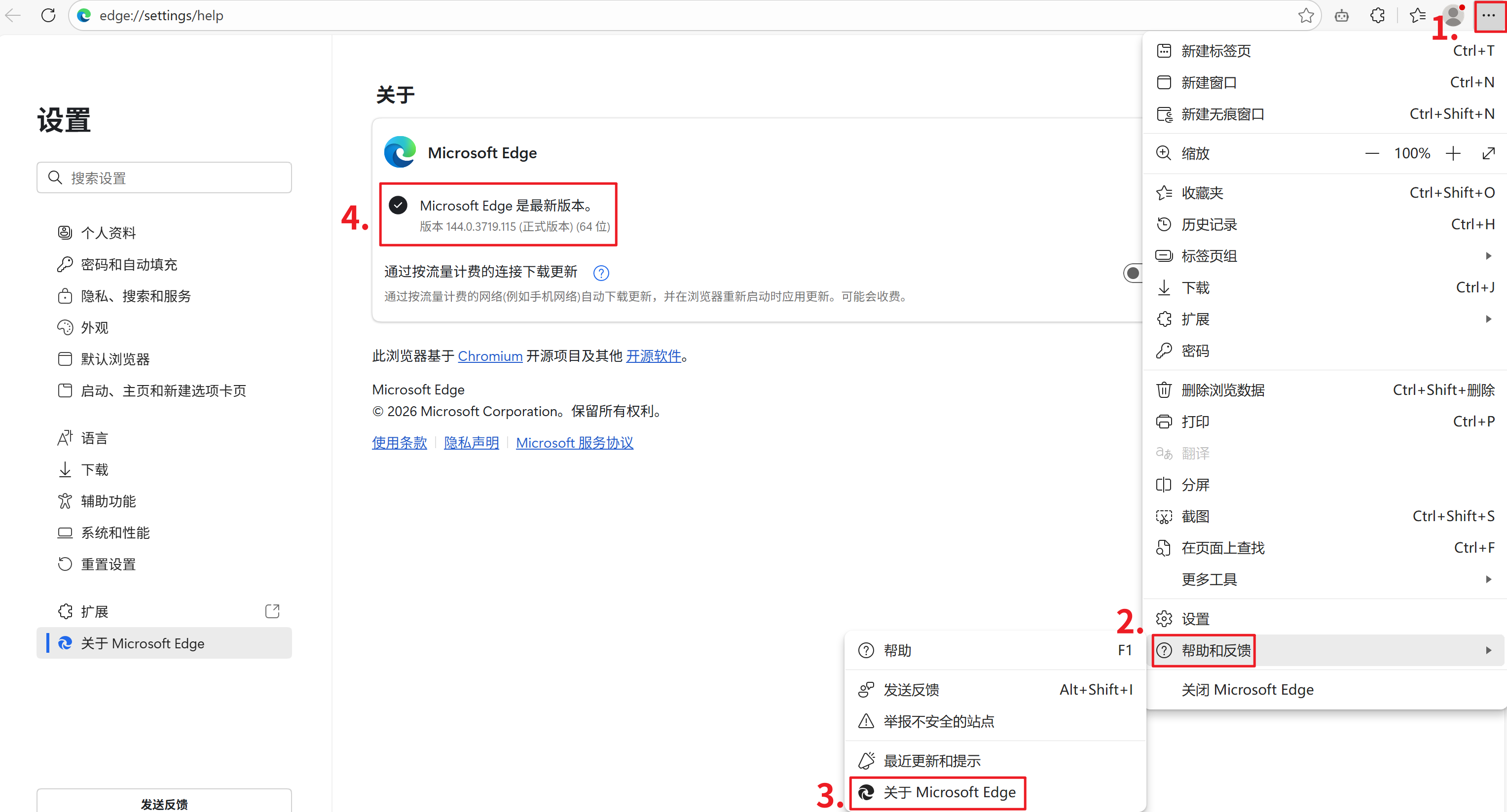 到【设置—帮助与反馈—关于 Microsoft Edge—可查看版本(若低于88需升级)升级之后重启即可】